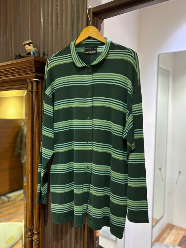 <ABOUT> フィンランドのブランド、マリメッコのコットンシャツ。 柔らかい天竺編みにグリーンベースのボーダー。なかなか見ないデザインかと。 立ち襟やスナップボタン、ブルゾンっぽいポケットなど各所のディテールも面白いです。 薄手かつ大きめサイズなので羽織として大活躍の1着です。 右袖真ん中辺りにほつれがあります。 左袖裾あたりに小穴があります。 両裾口にほつれがあります。 コンディションは写真でご確認ください。 EUROPE MADE 取扱店舗:有楽町店 <SIZE> SIZE XL 肩幅 :59.5cm 身幅 :61cm 着丈 :77cm 袖丈 :55cm ※平置きでの採寸となりますので多少の誤差がある場合がございます。 予めご了承下さい。 <CONDITION> used <NOTE> VINTAGE商品の為、汚れや傷等がある場合がございます。 ご理解の上、ご注文をお願い致します。