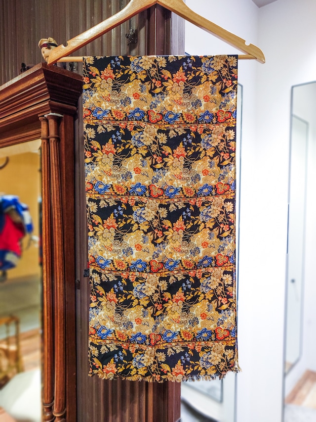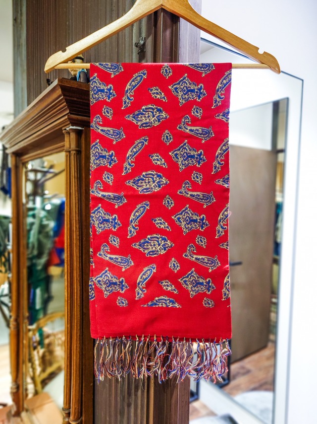 <ABOUT> イングランドメイドのレーヨンスカーフ。 濃い赤色をベースとしたペイズリーと独特な大きめの柄が印象的。 厚みのあるレーヨン生地で、マフラーがわりとしてもおすすめの一枚です。 MADE IN ENGLAND 取扱店舗:有楽町店 <SIZE> 長さ:106cm 幅 : ※平置きでの採寸となりますので多少の誤差がある場合がございます。 予めご了承下さい。 <CONDITION> USED