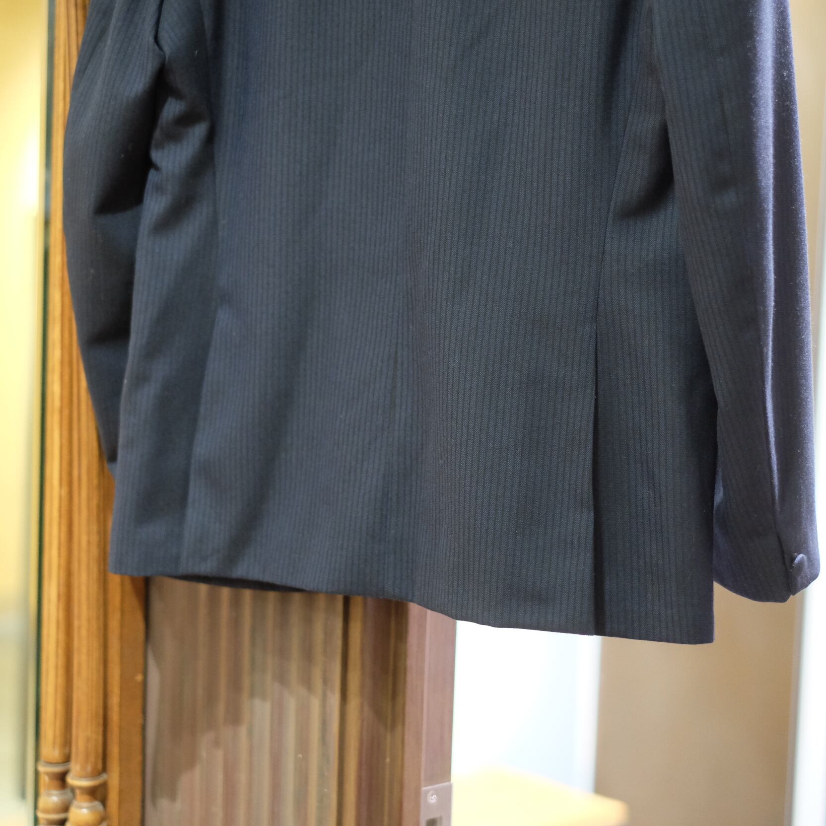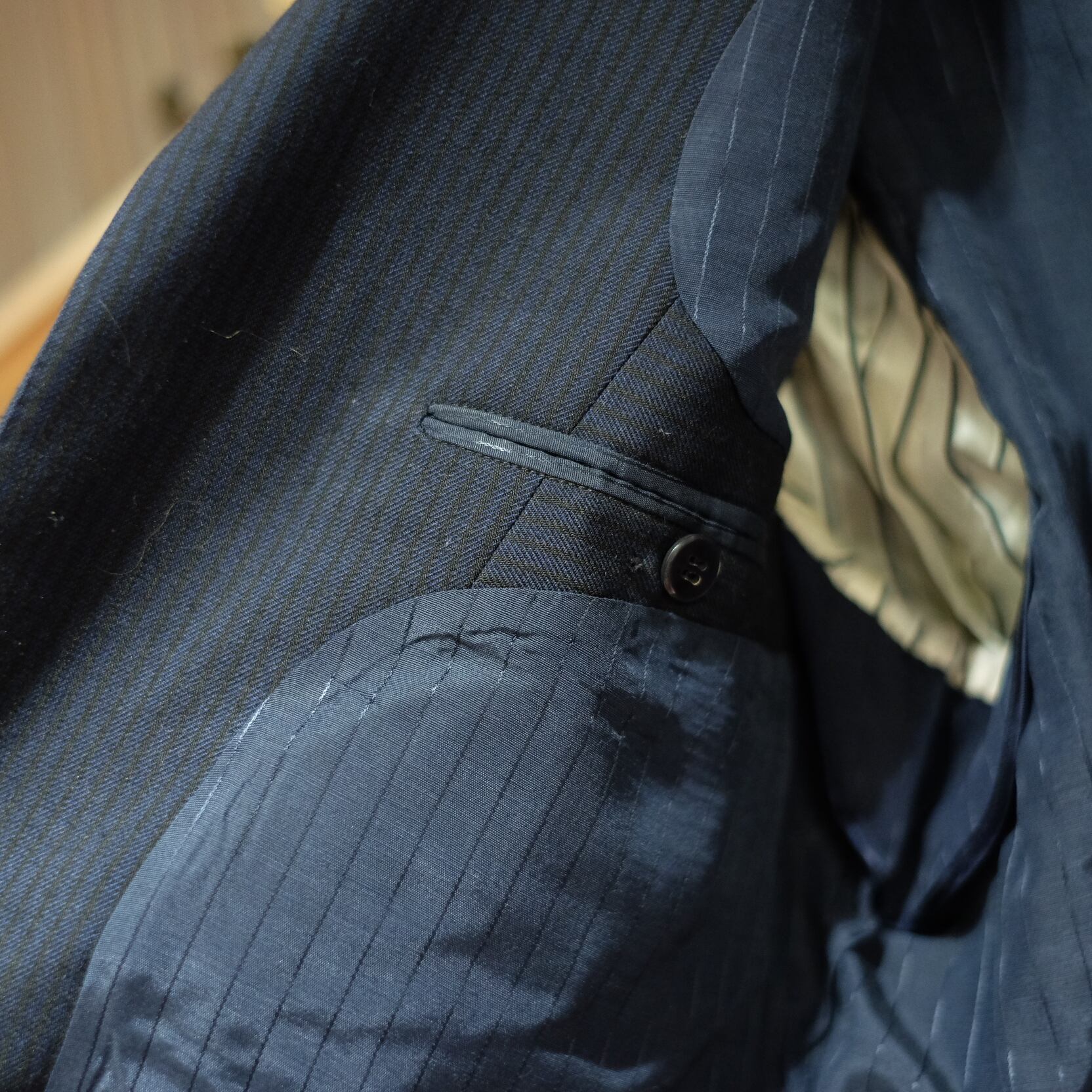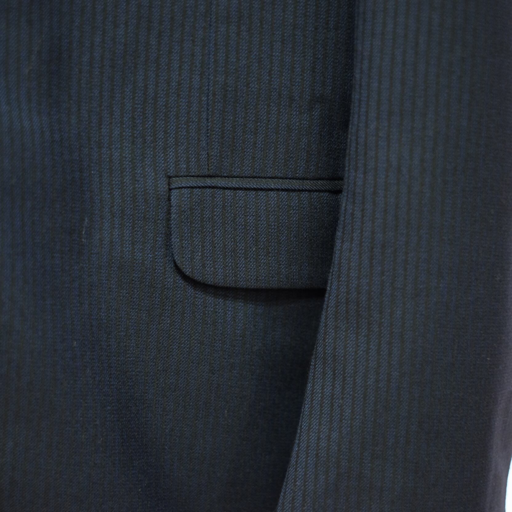 ブルー、ブラックのストライプ柄で3ボタンで狭目なVゾーンなのも良いですね。
