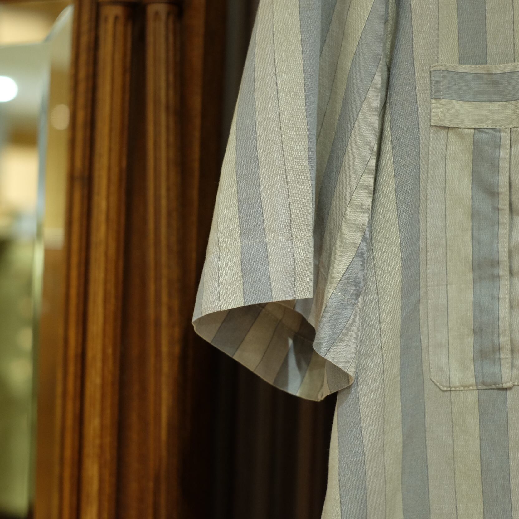 恐らくコットンポリ混紡生地で、渋い配色のストライプ柄がかっこいいです。