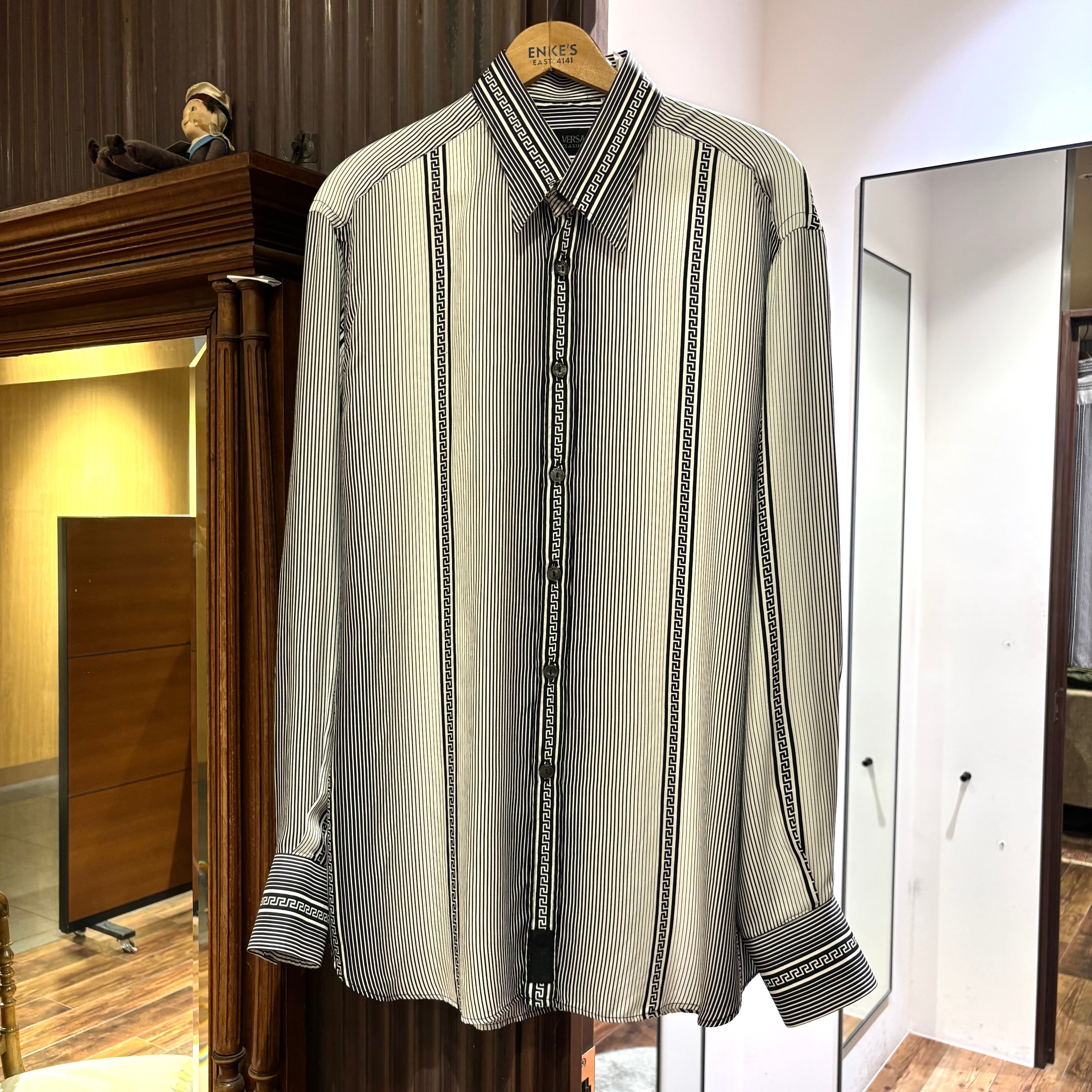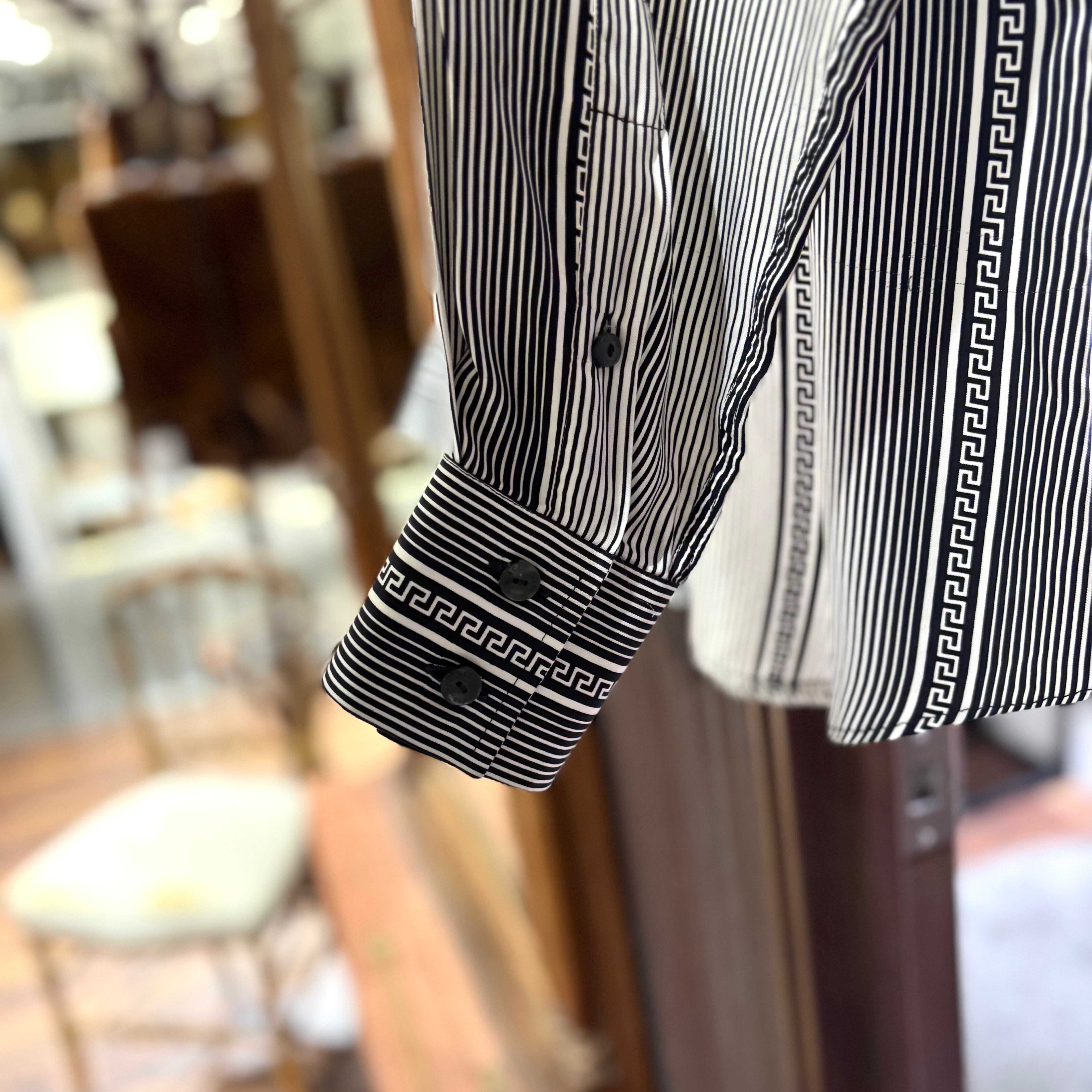 薄手のツルッとした上質なシルクに、太さの変わるストライプと凝ったデザインのプリントが入ります。