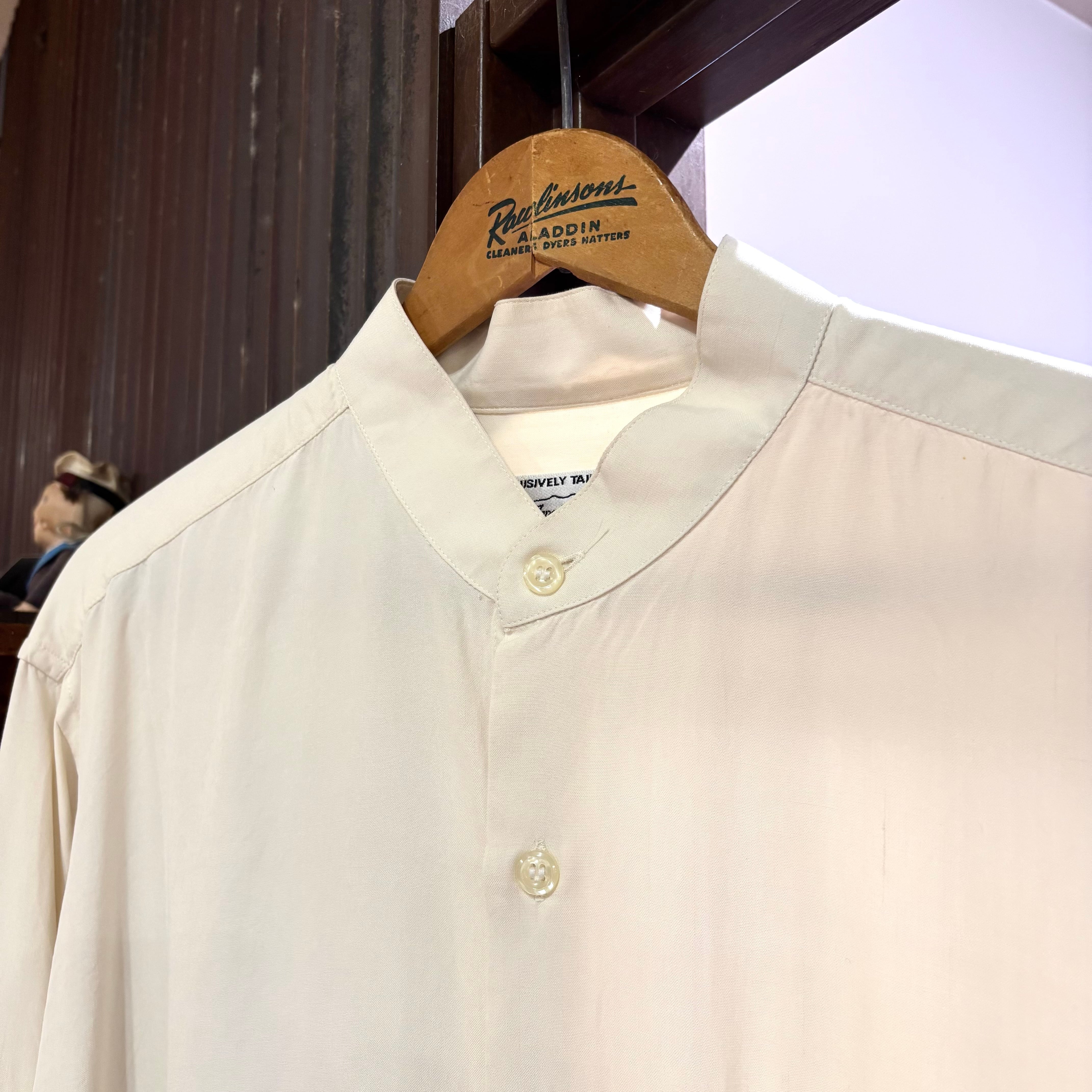 トロトロのピュアシルクにすっきりしたバンドカラー、胸ポケットは片玉縁の袋ポケット。