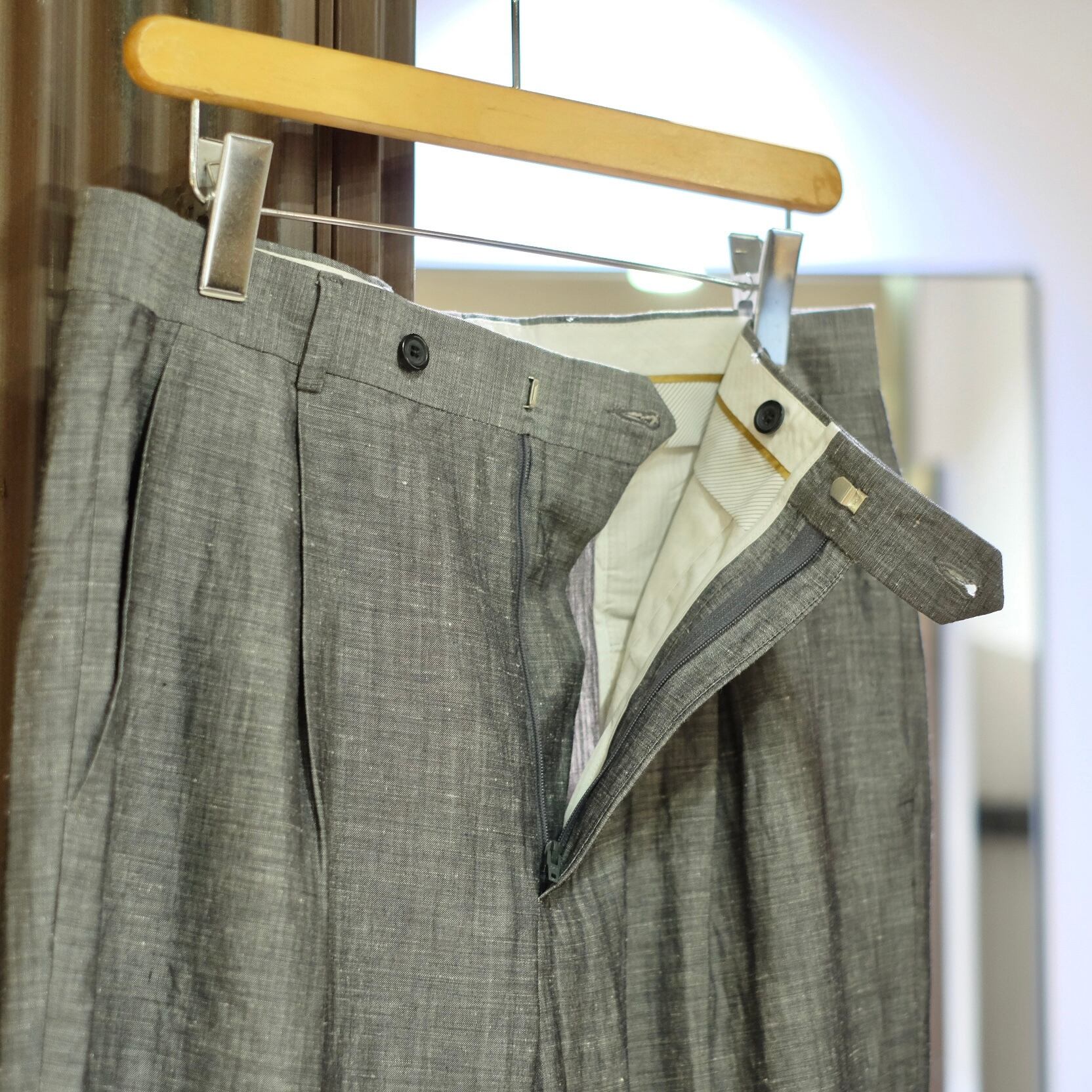 非常にライトなサマーウールとリネンの混紡生地でらシャンブレーの様な織りの奥行きある表情が魅力的です。