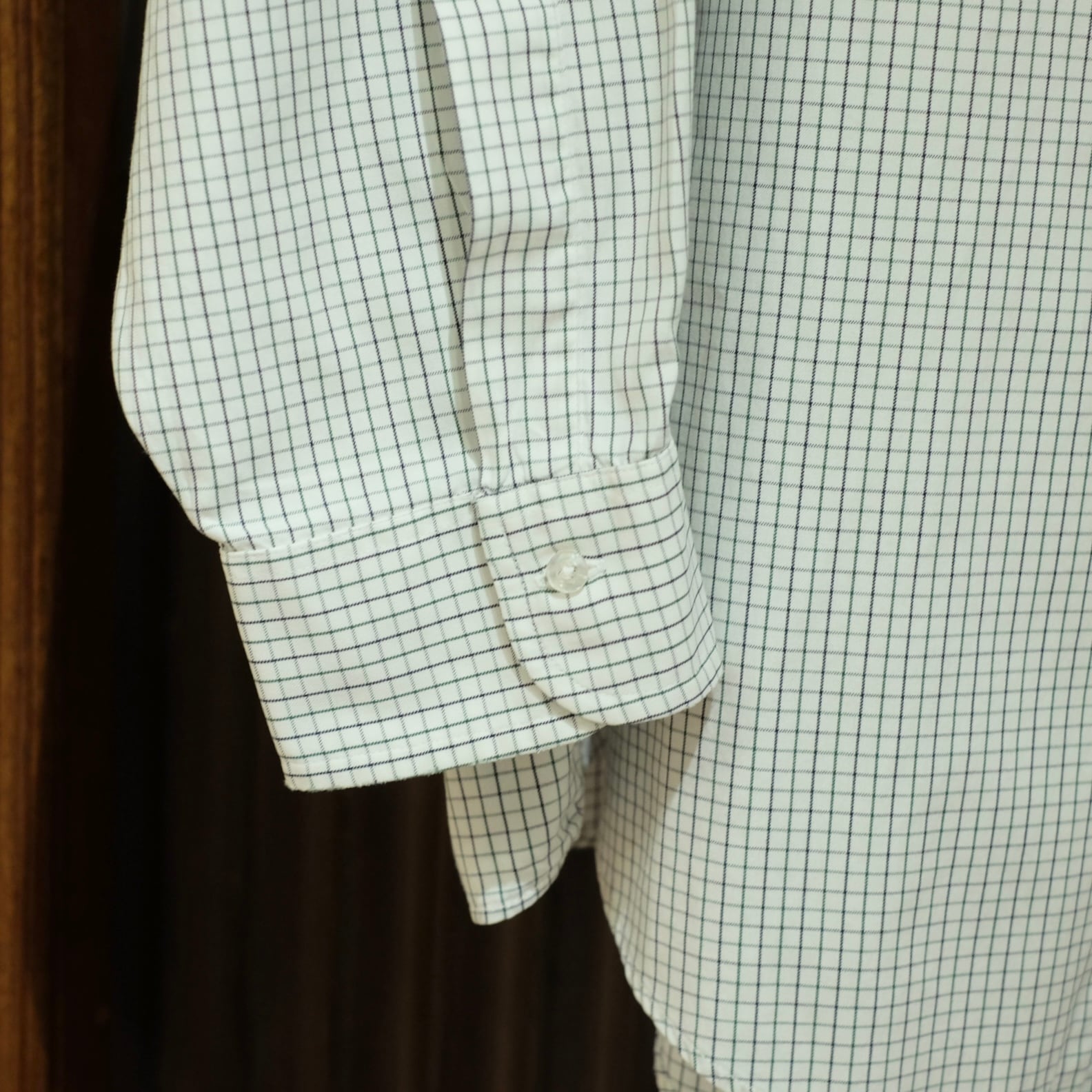 白地にブラックとグリーンの織りが入るチェック。落ち着いた色合いで手に取る機会も多いかと。