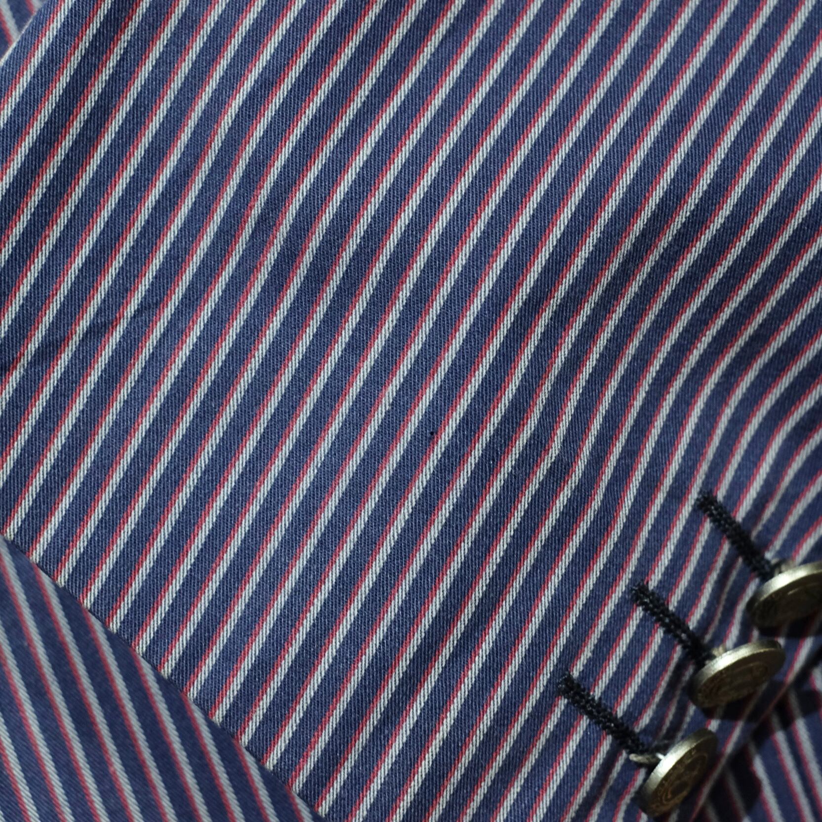 ネイビーベースにホワイトとレッドの入る、ストライプのコットン生地。