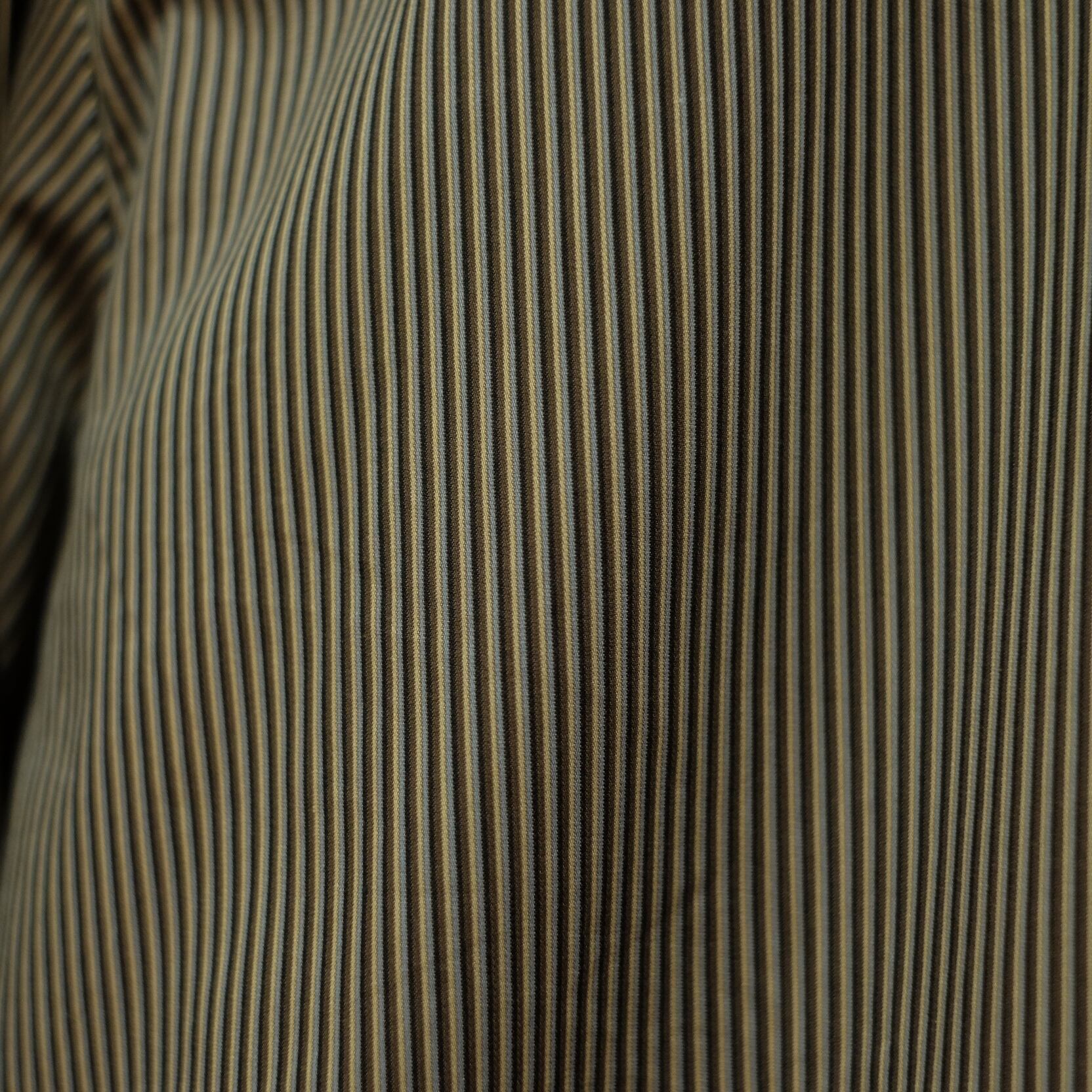 柔らかなコットン平織り生地で、グレー、ライトブラウン、ブラウン、ブラックのマルチストライプ。