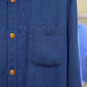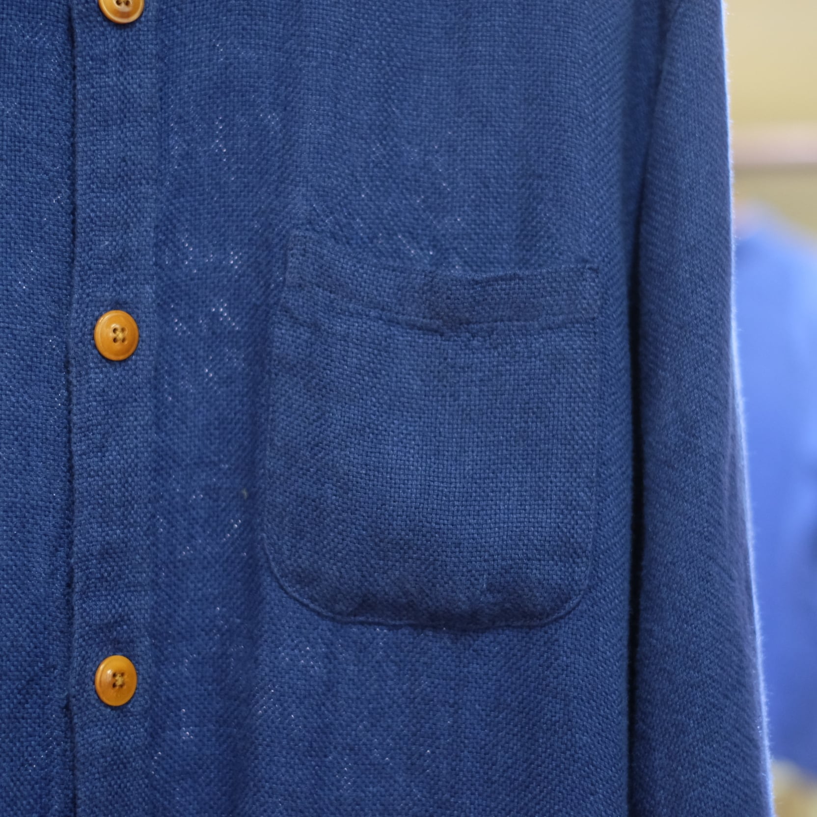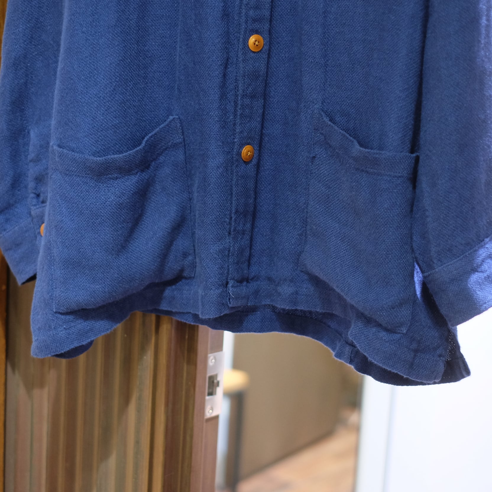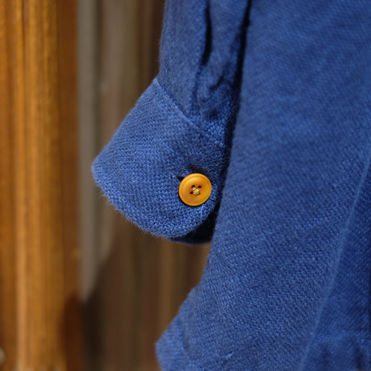 太くて荒い織りのリネン素材に鮮やかなブルーカラー。飴色のボタンも気が利いてます。