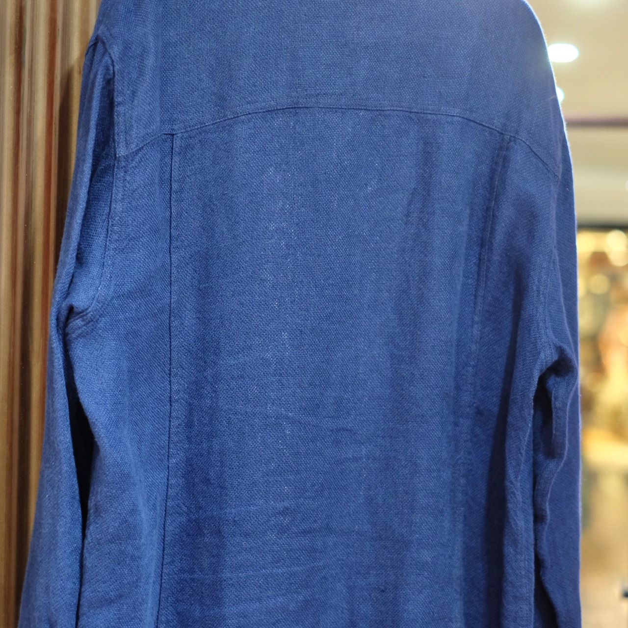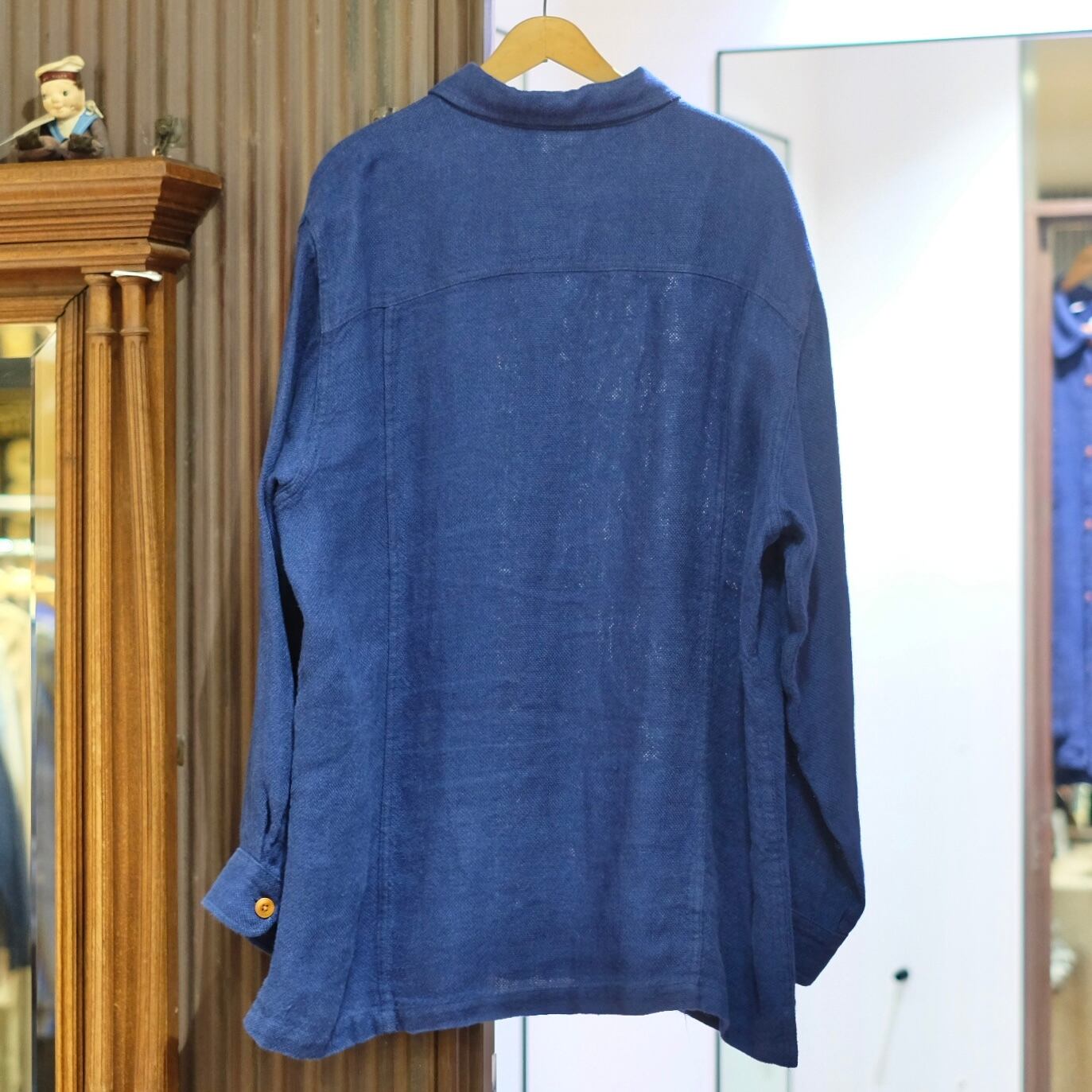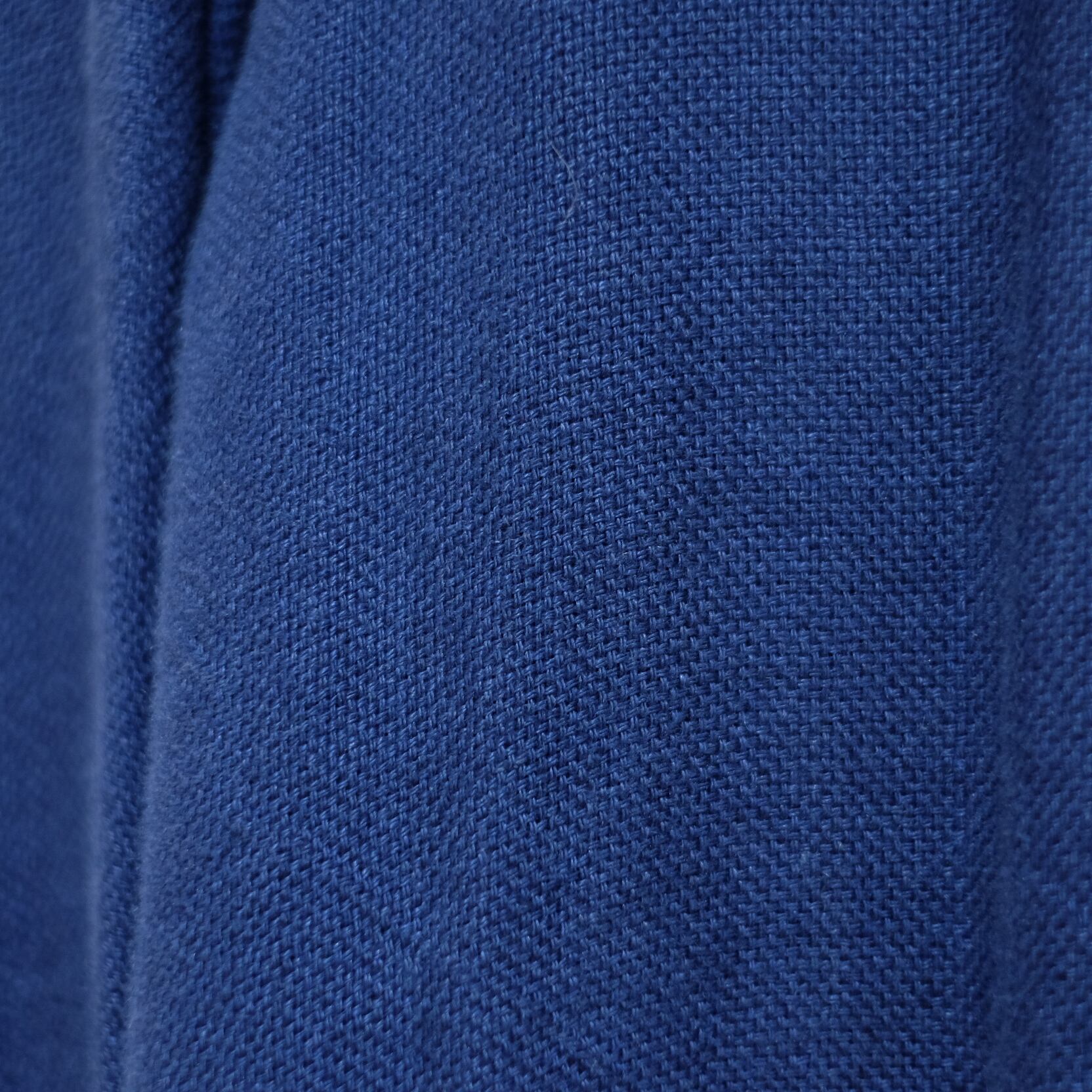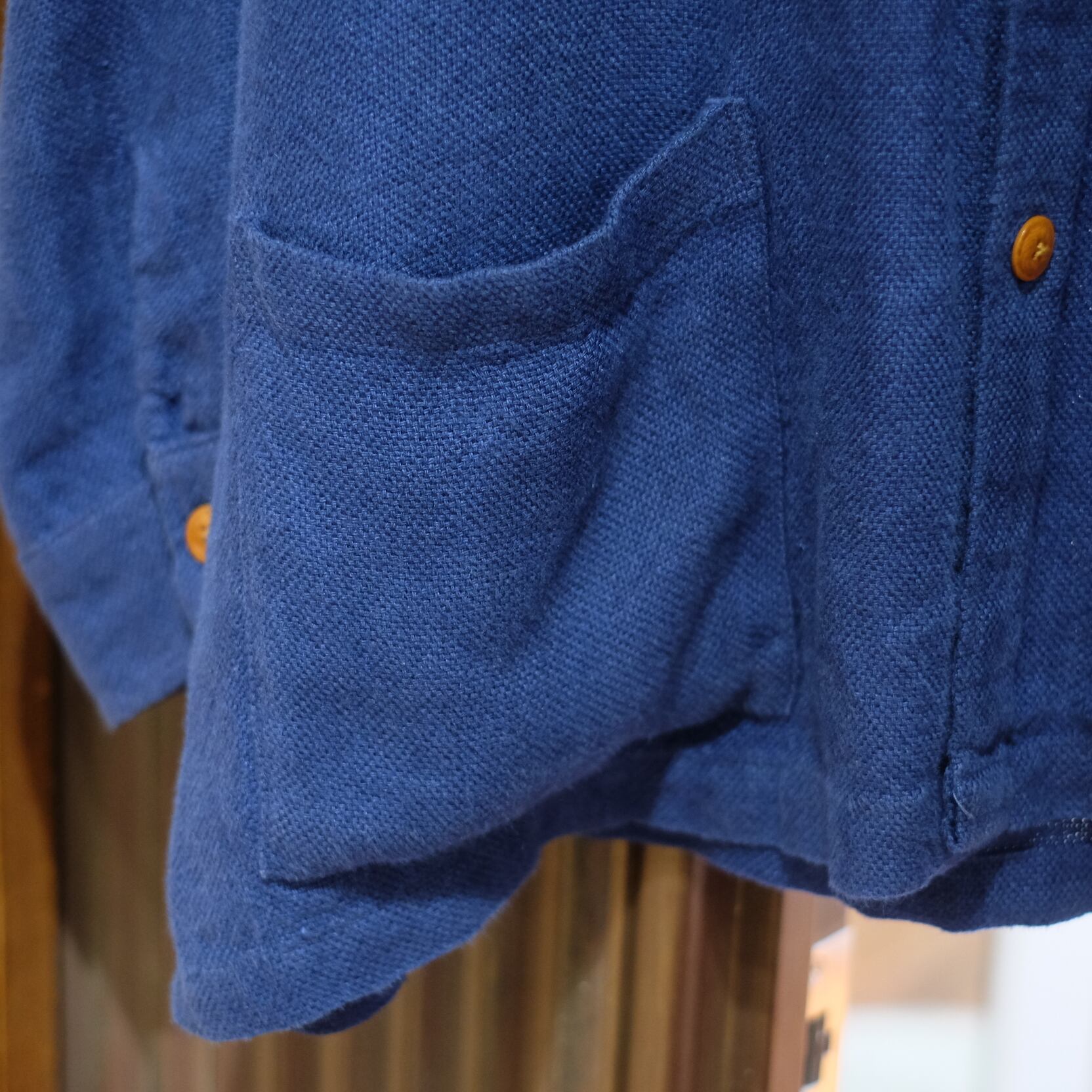 太くて荒い織りのリネン素材に鮮やかなブルーカラー。飴色のボタンも気が利いてます。