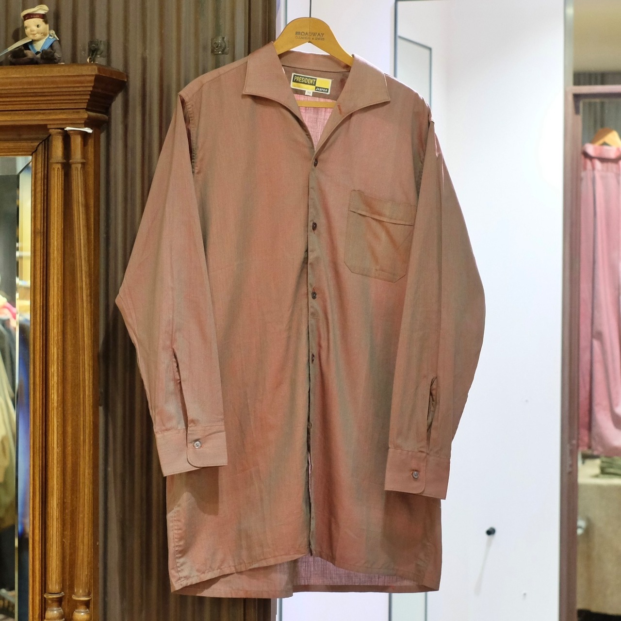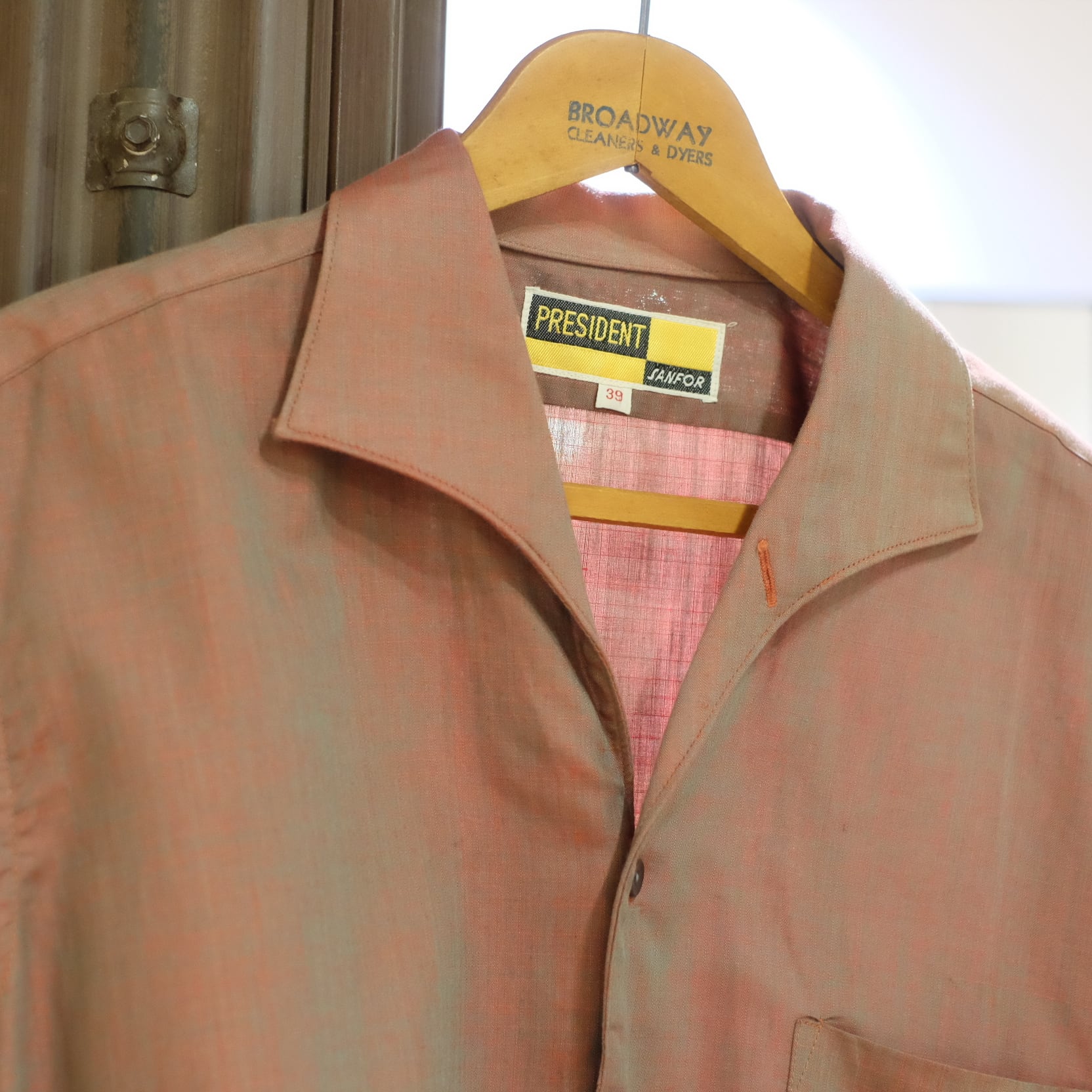 玉虫がかったレッドカラーとグリーンの上品な生地感で、綺麗な襟型のシャークカラーと相まってセクシーな印象の一着。