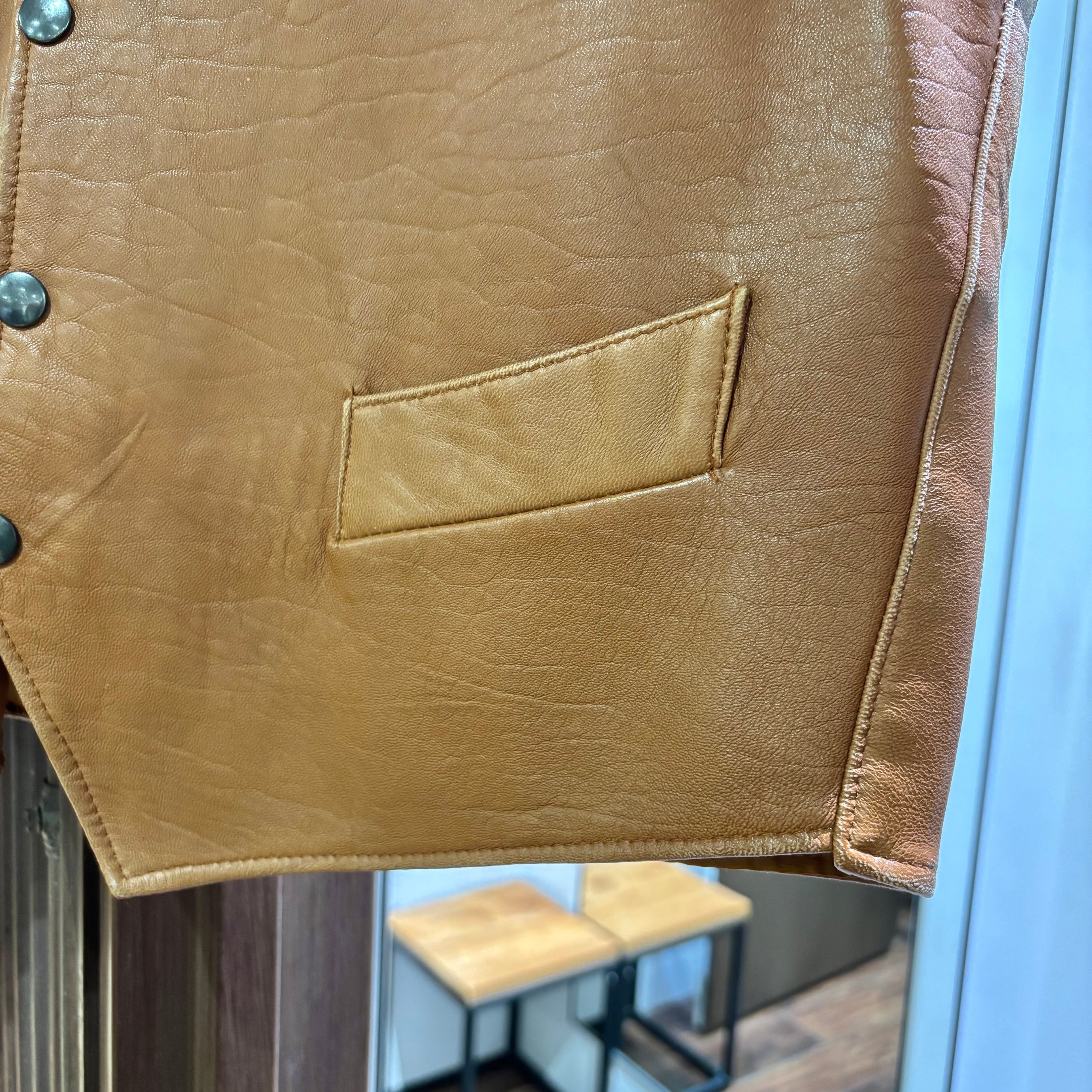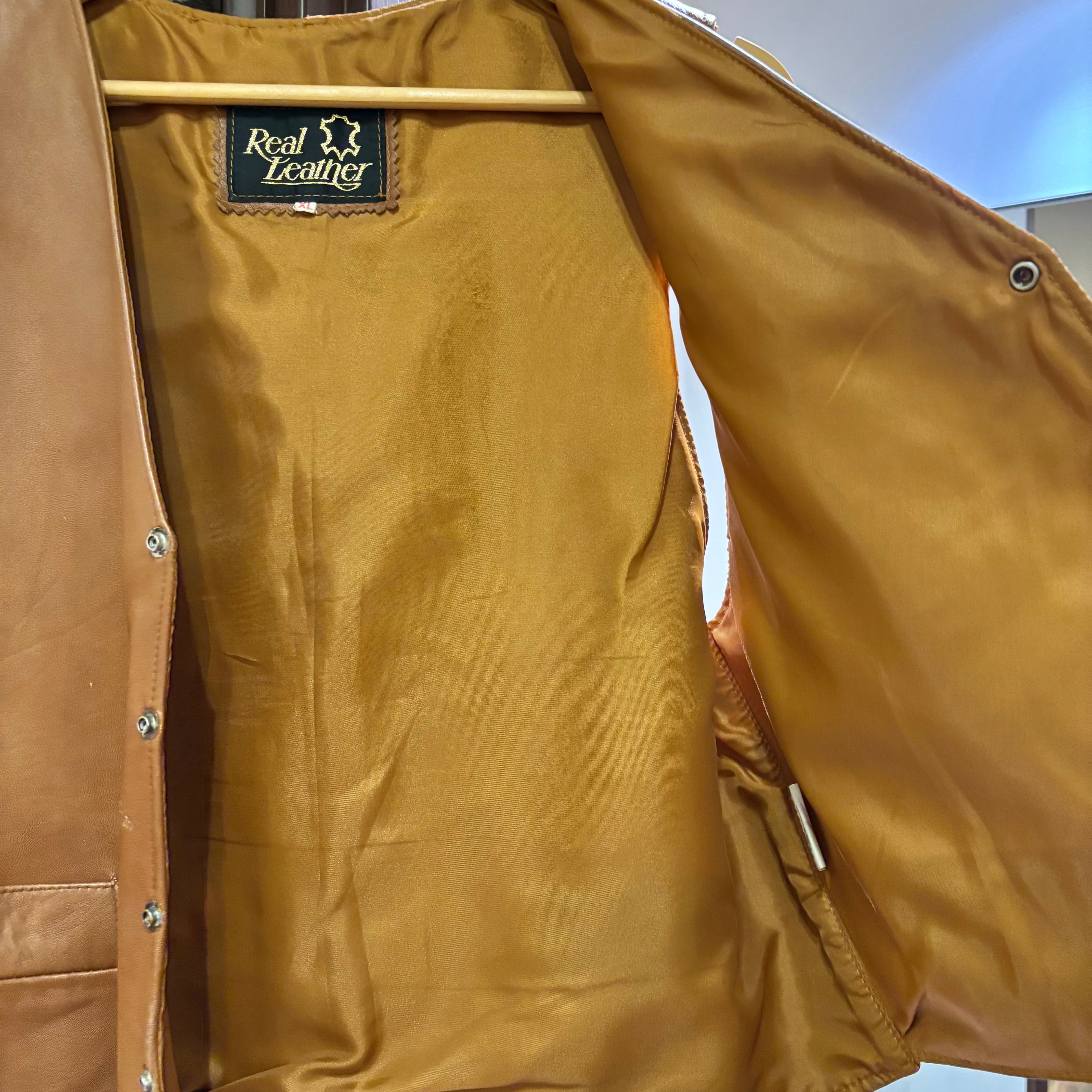 柔らかいブラウンレザーにフロントはスナップボタンと普段使いしやすそうな一着。