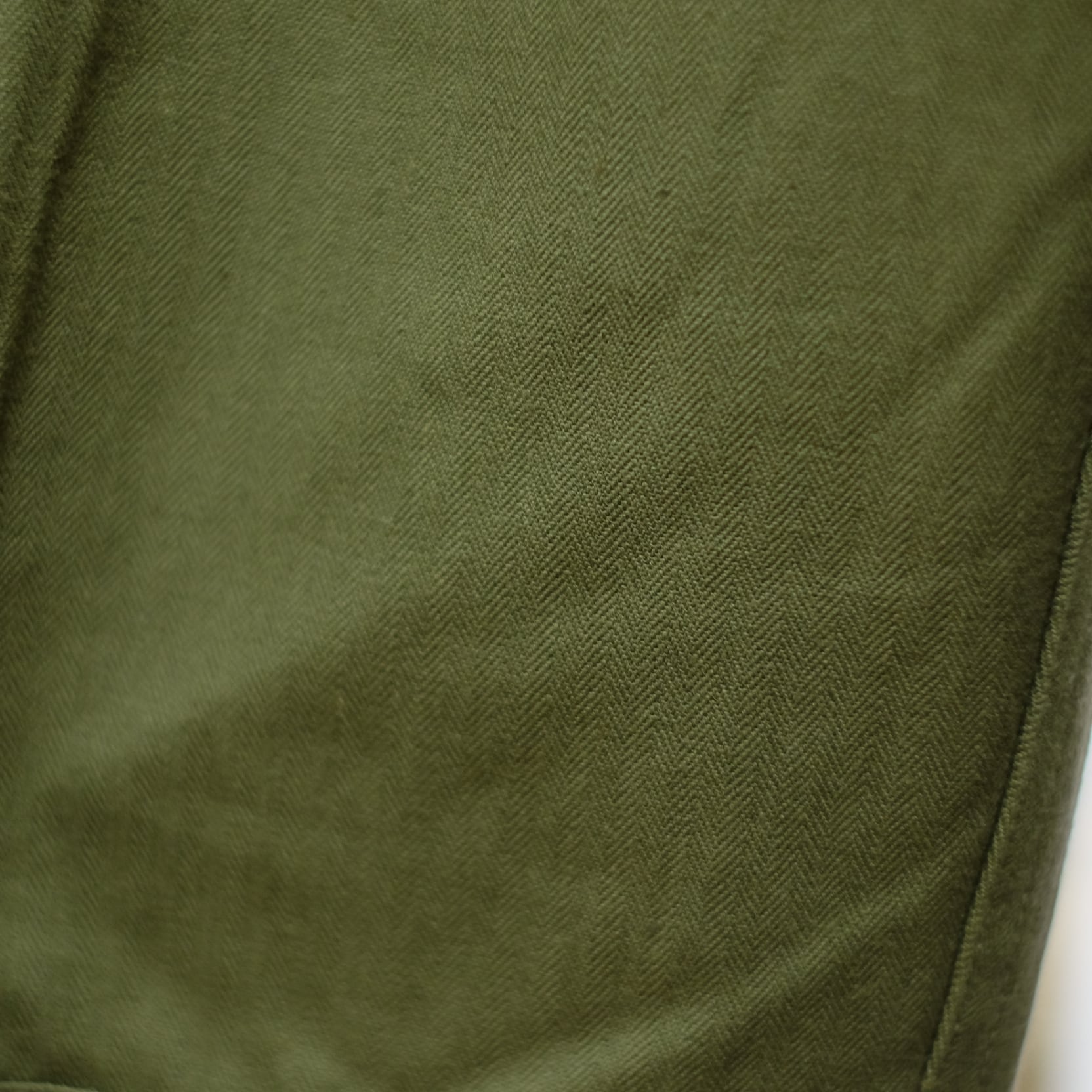オリーブカラーで、中厚のHBT地にテーパードシルエット。