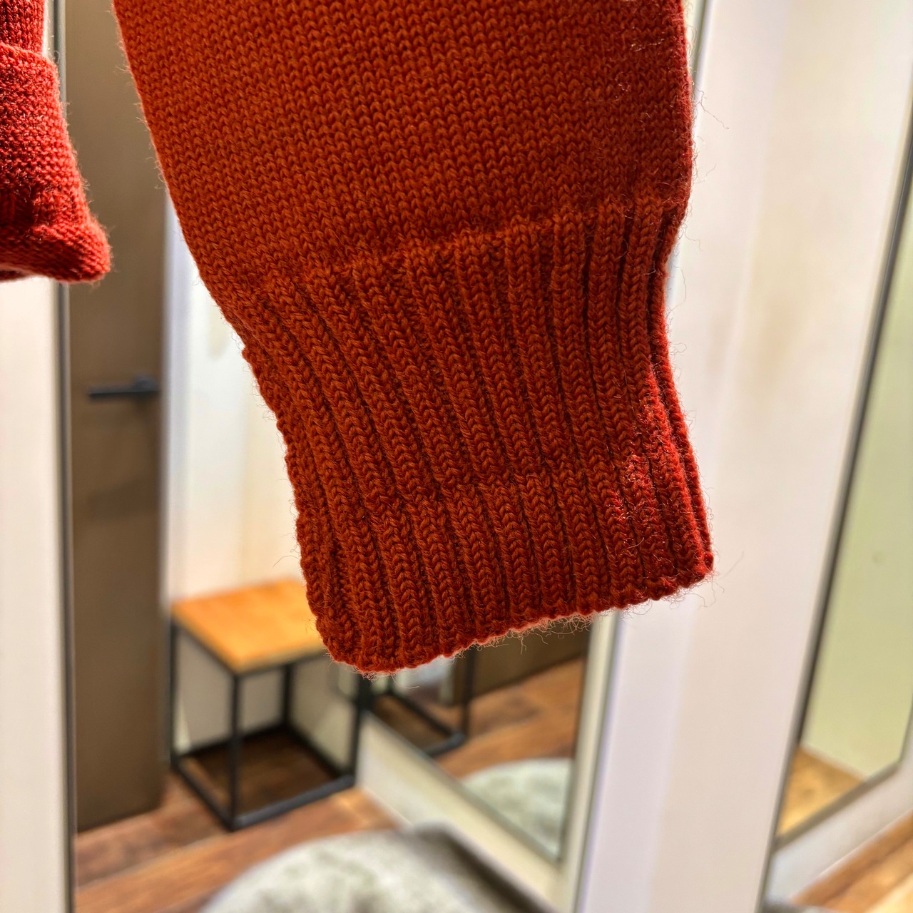 色として非常に珍しい深みのあるオレンジ色のガンジーセーター。
