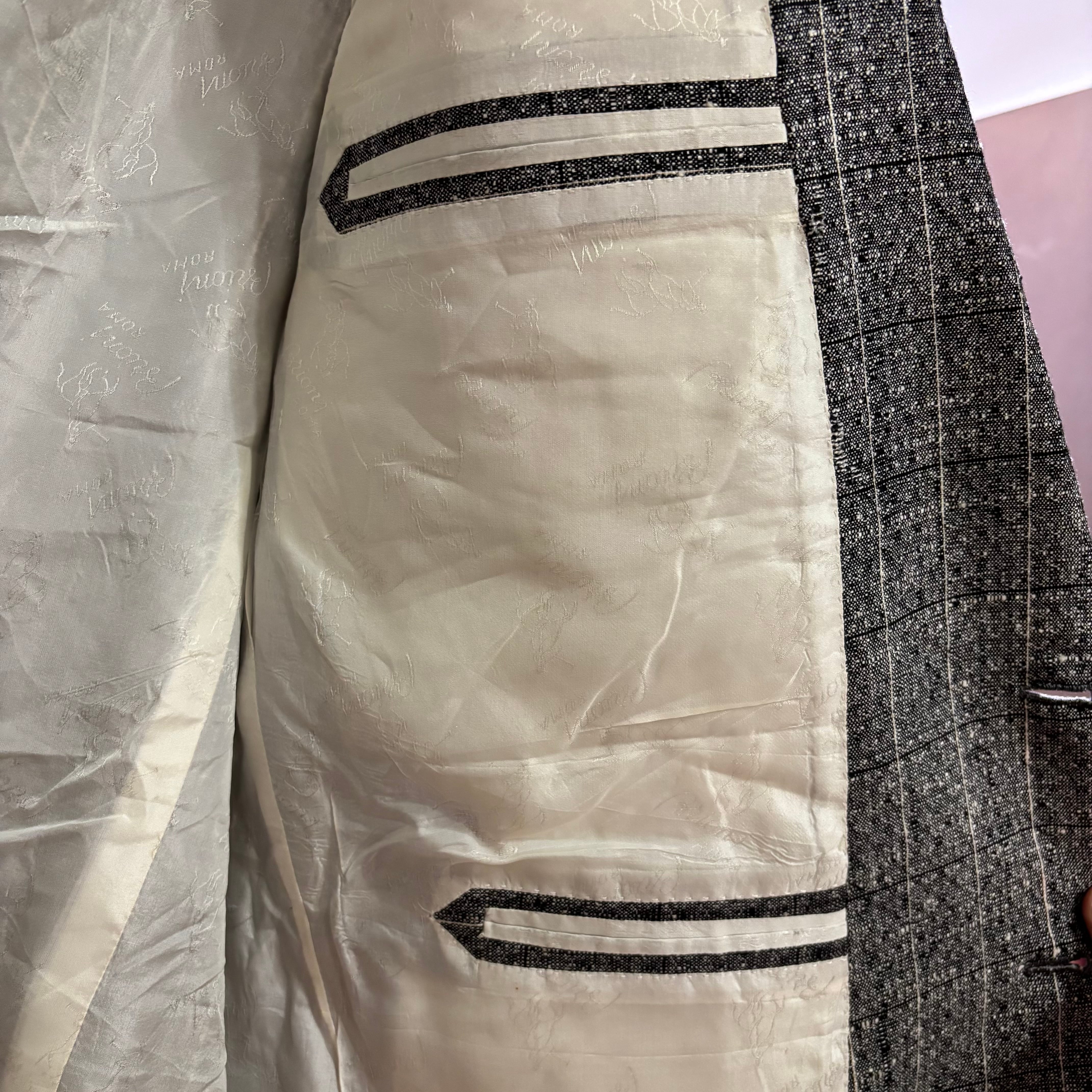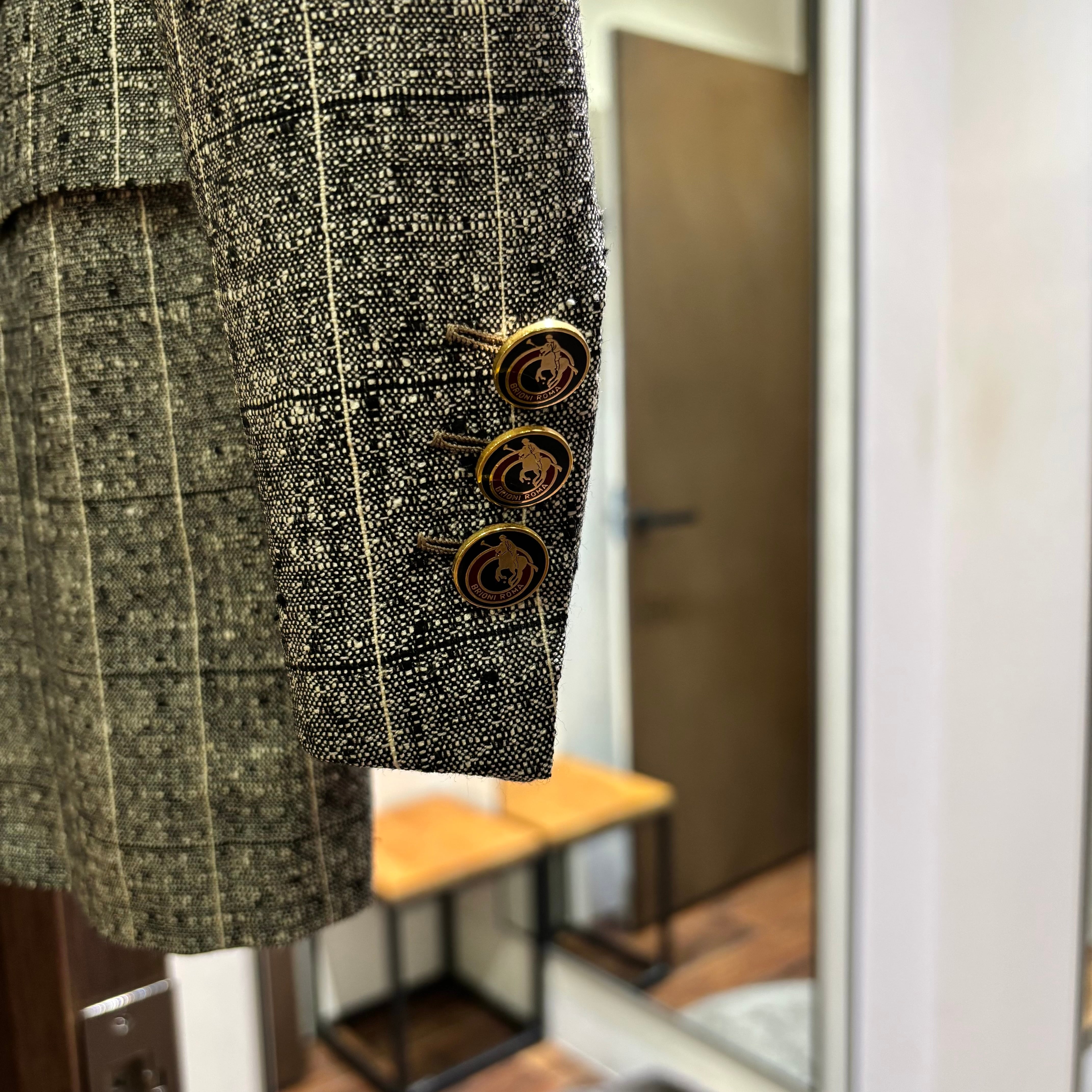 剣先台場仕立てにポケット両玉縁の良い作りで、グレー貴重で白と黒のネップとラインが入るチェック柄も魅力的です。