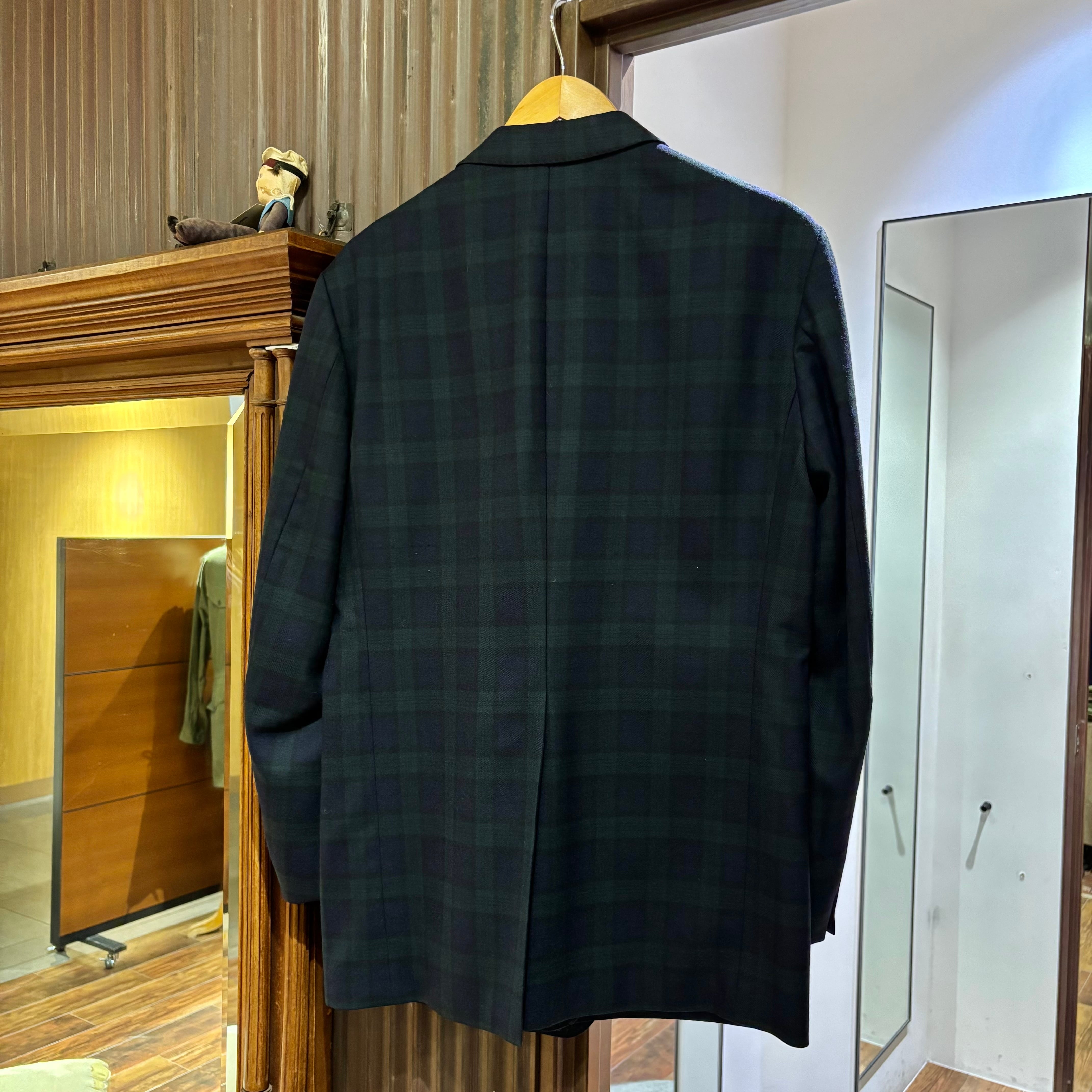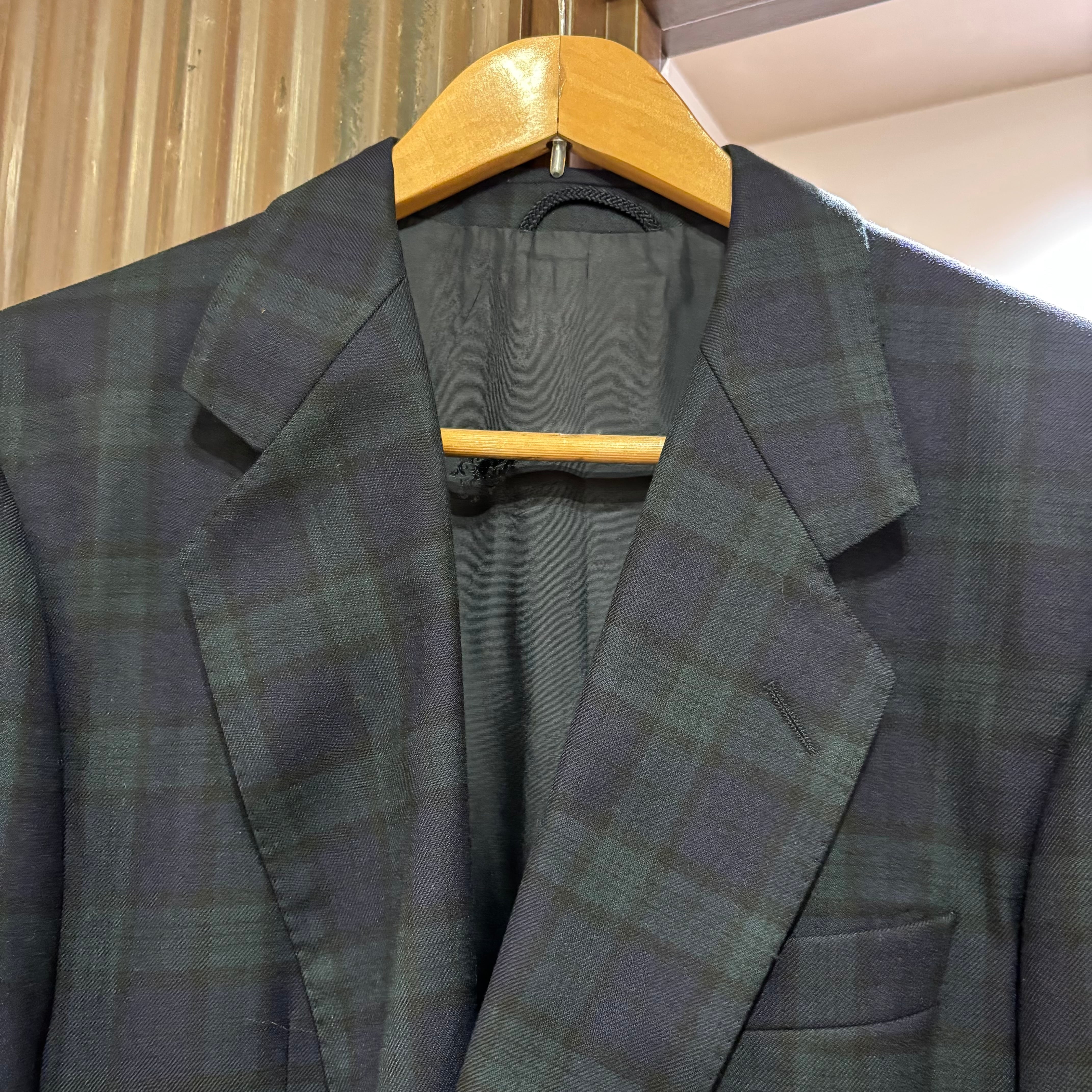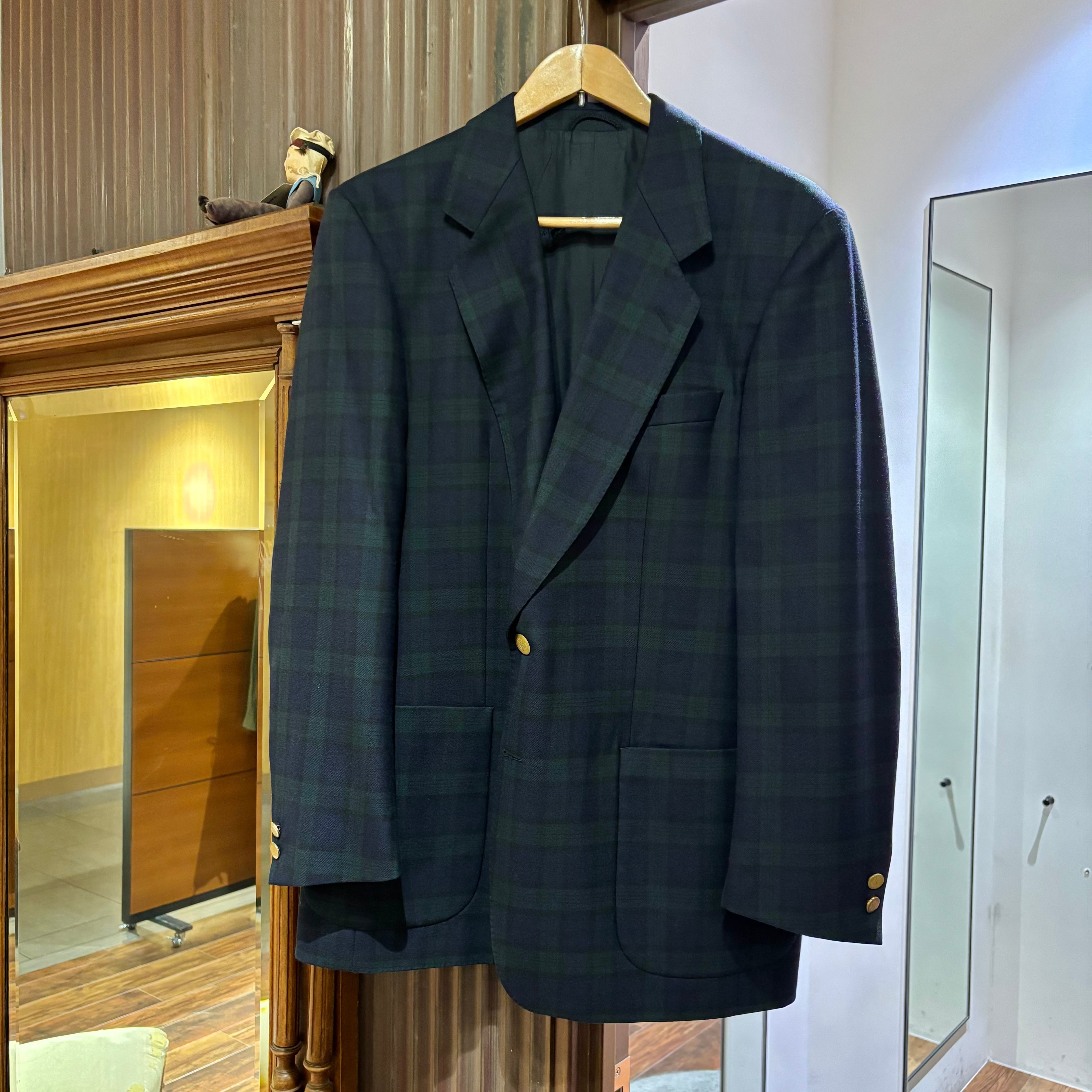 ブラックウォッチ柄のチェックパターンで、深めのVゾーンに金ボタンが映えます。