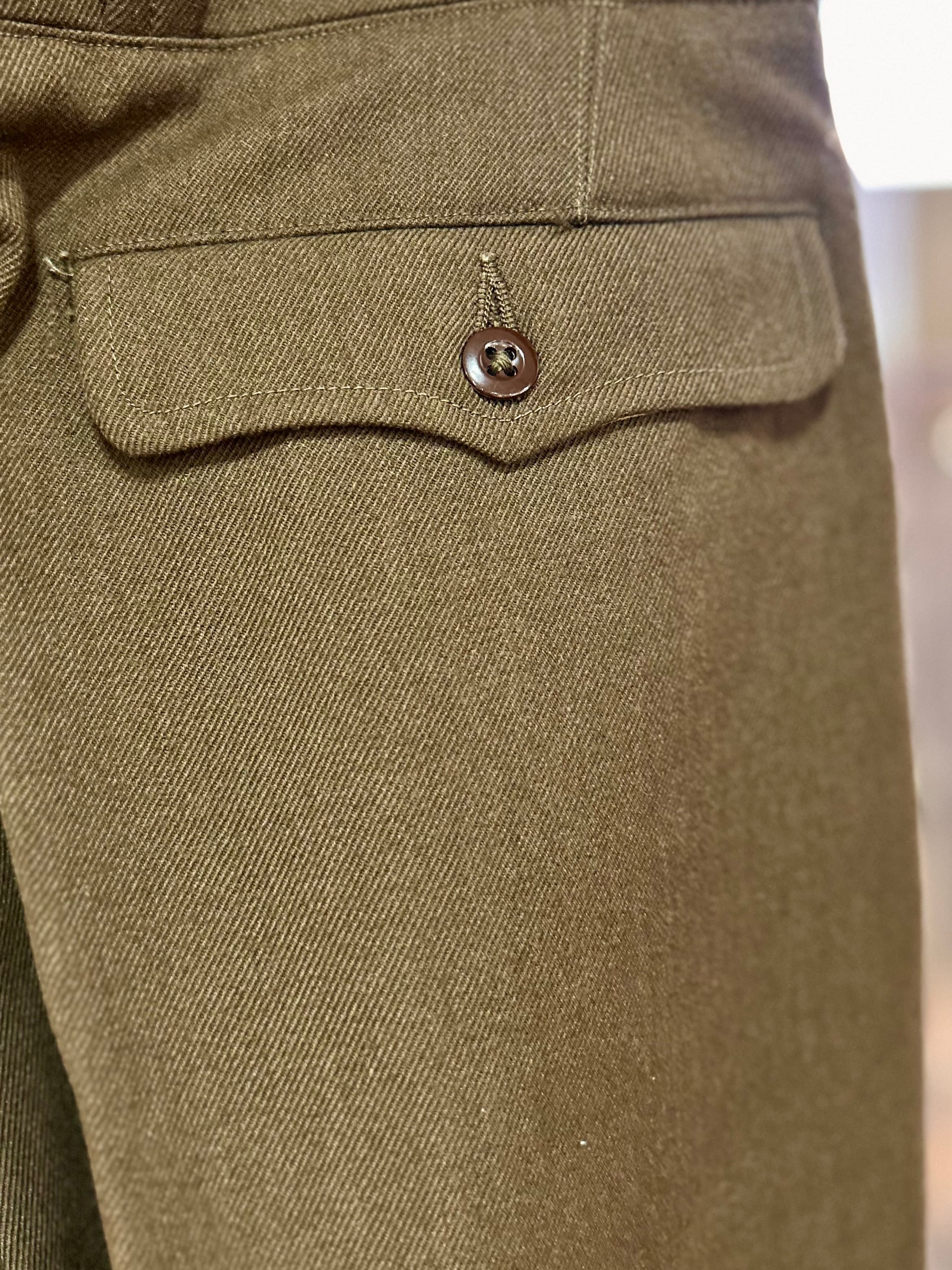 深い股上にフロントのボタンフライ、スラッシュポケット、フランス軍らしいフラップ付きのバックポケット等ディテールも魅力的です。
