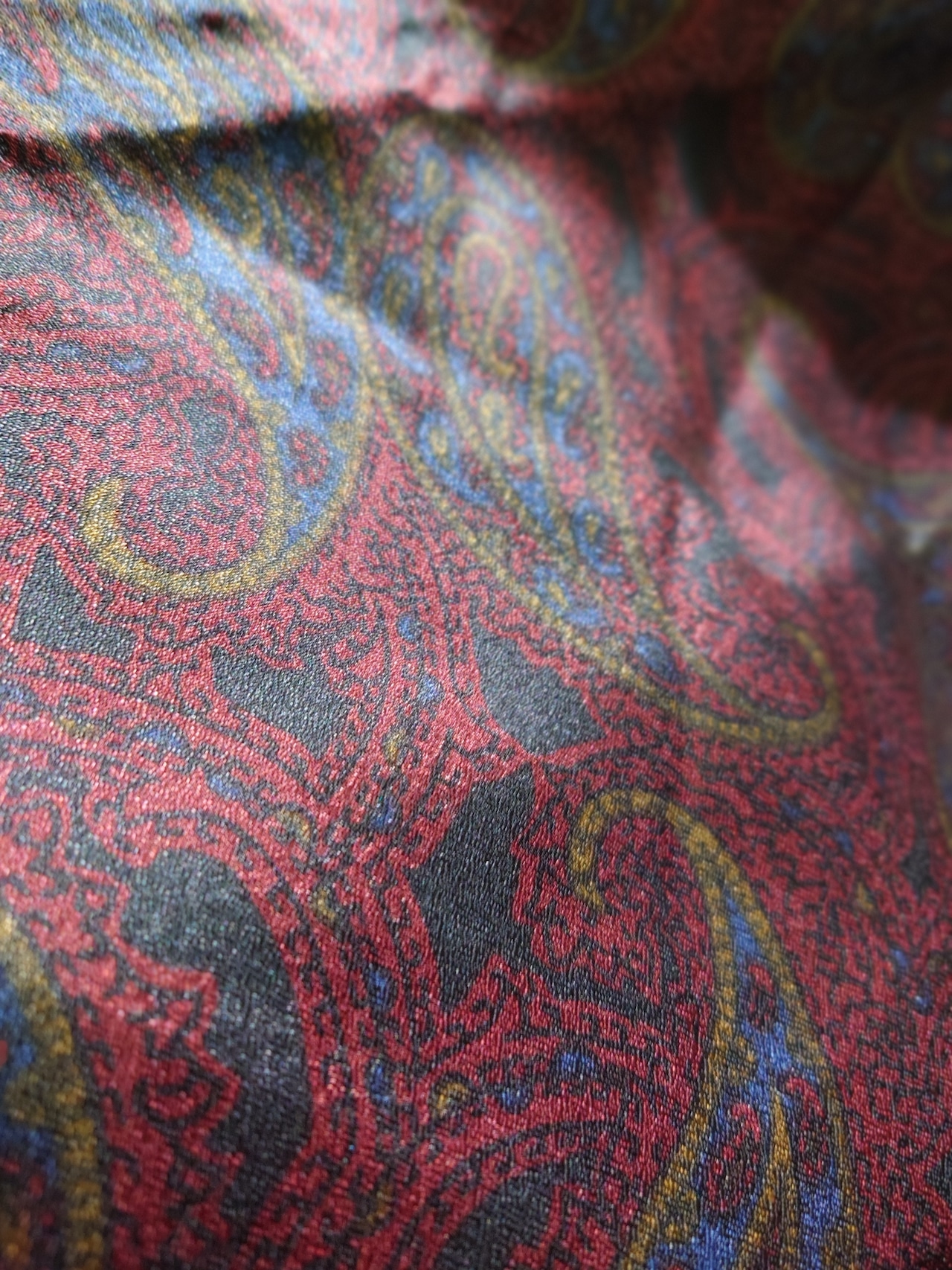 暗めのレッド×ブラックにかなり大きいペイズリー柄が印象的な一枚。