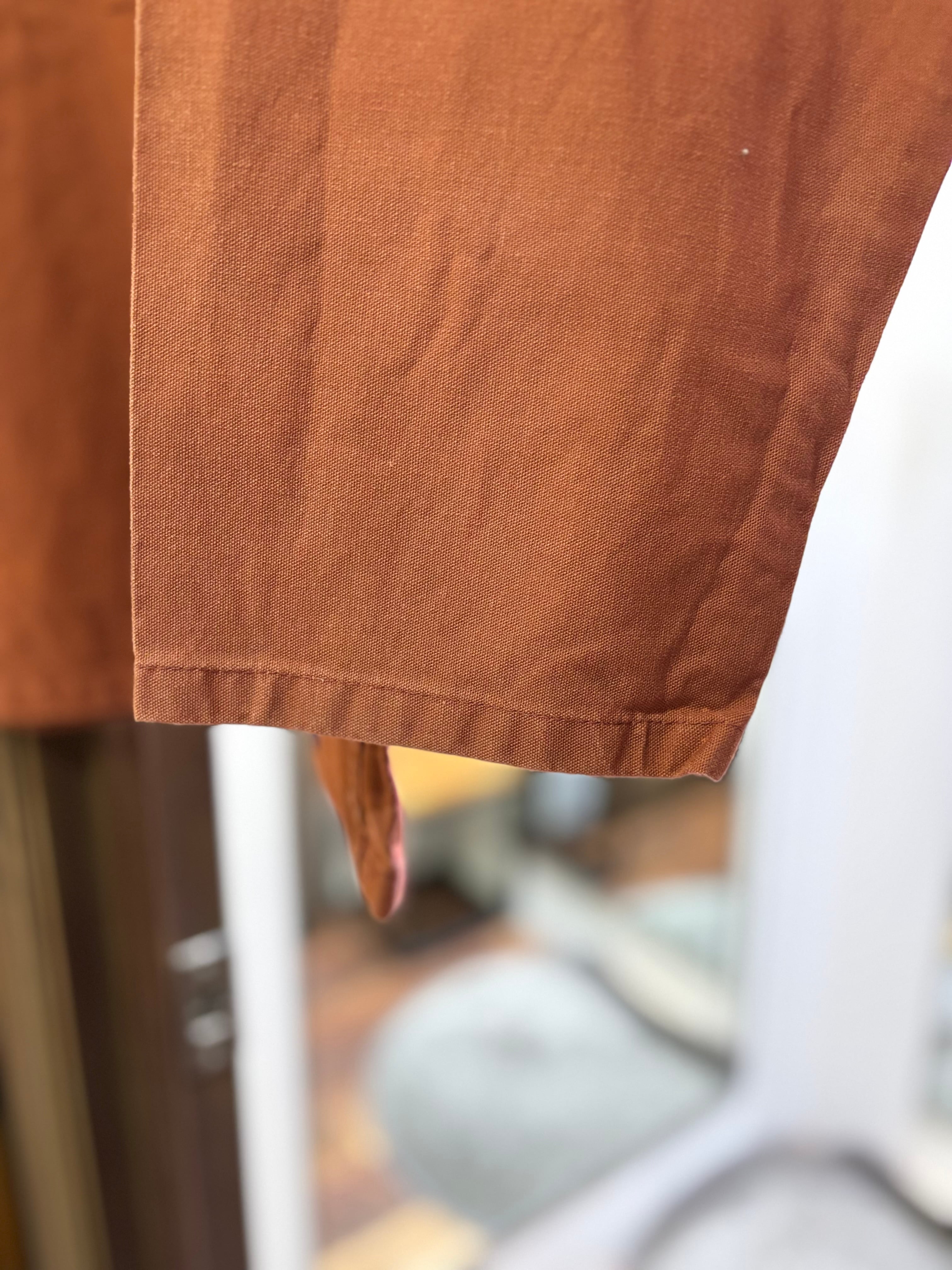 ガサッとした肌触りかつ薄手な綿100%の平織り生地にフェードしたコーラルピンクカラーの1着。