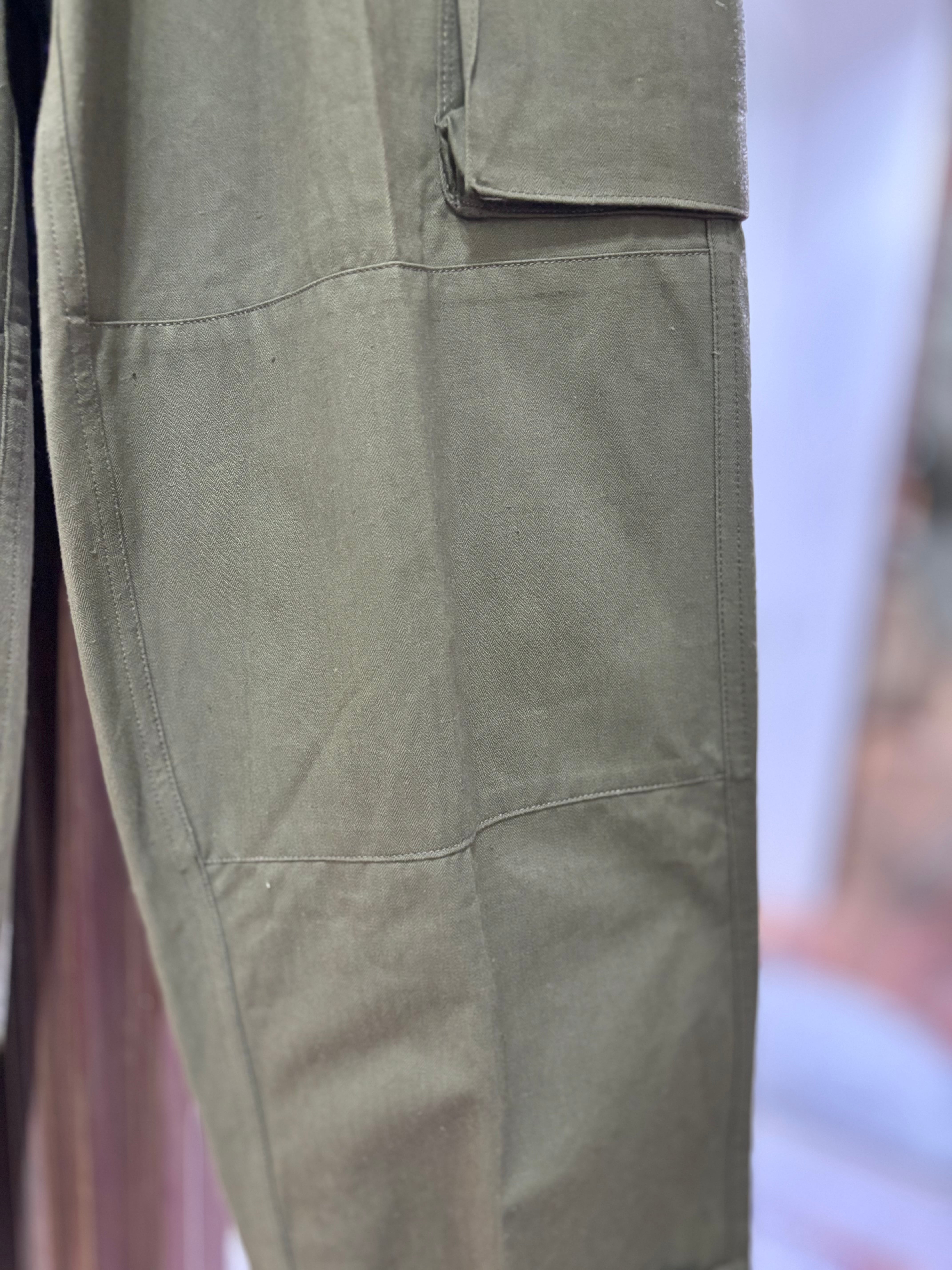 オリーブカラーで、中厚のHBT地にテーパードシルエット。