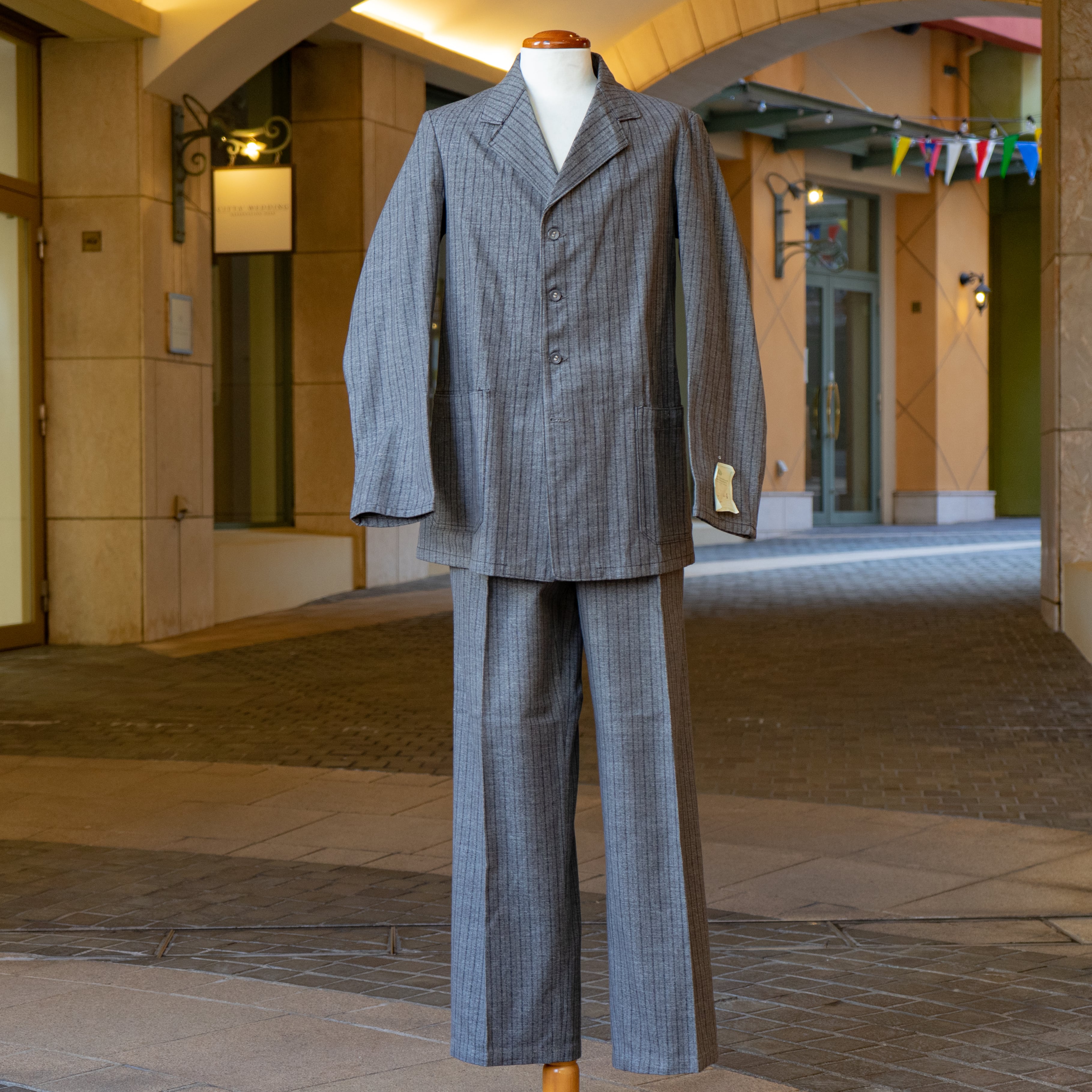 後ろ下がりの肩の縫いやVゾーンの狭い4つボタンのジャケット、ベルトループが無くウェストの後ろ側が高いパンツ、どこをとっても40年代らしいディティールに溢れたセットアップ。
