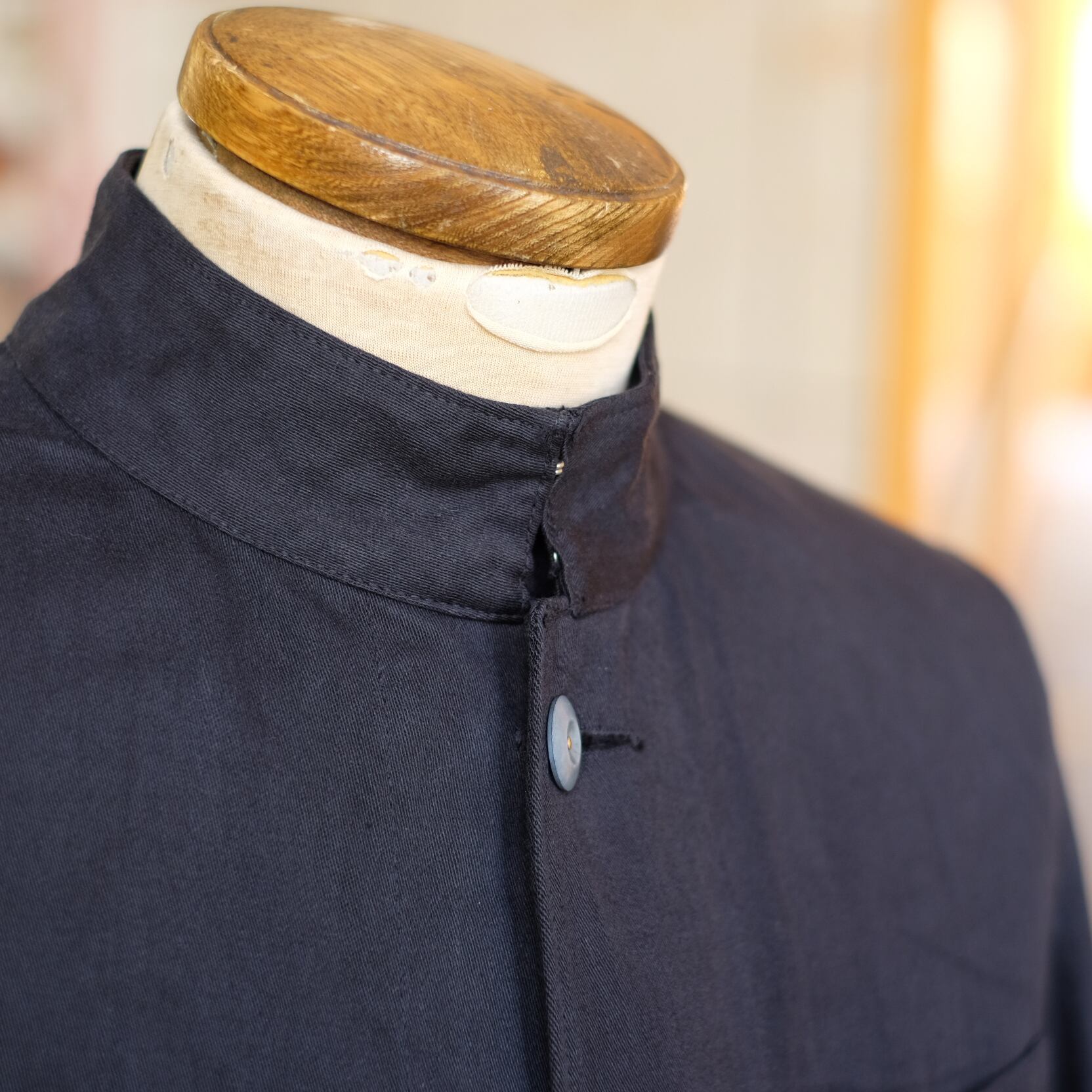 詰襟や胸の左右のポケットがミリタリーっぽいが、エポレットがないので比較的すっきりした雰囲気。イギリスのアイテムらしくダブルベンツも。