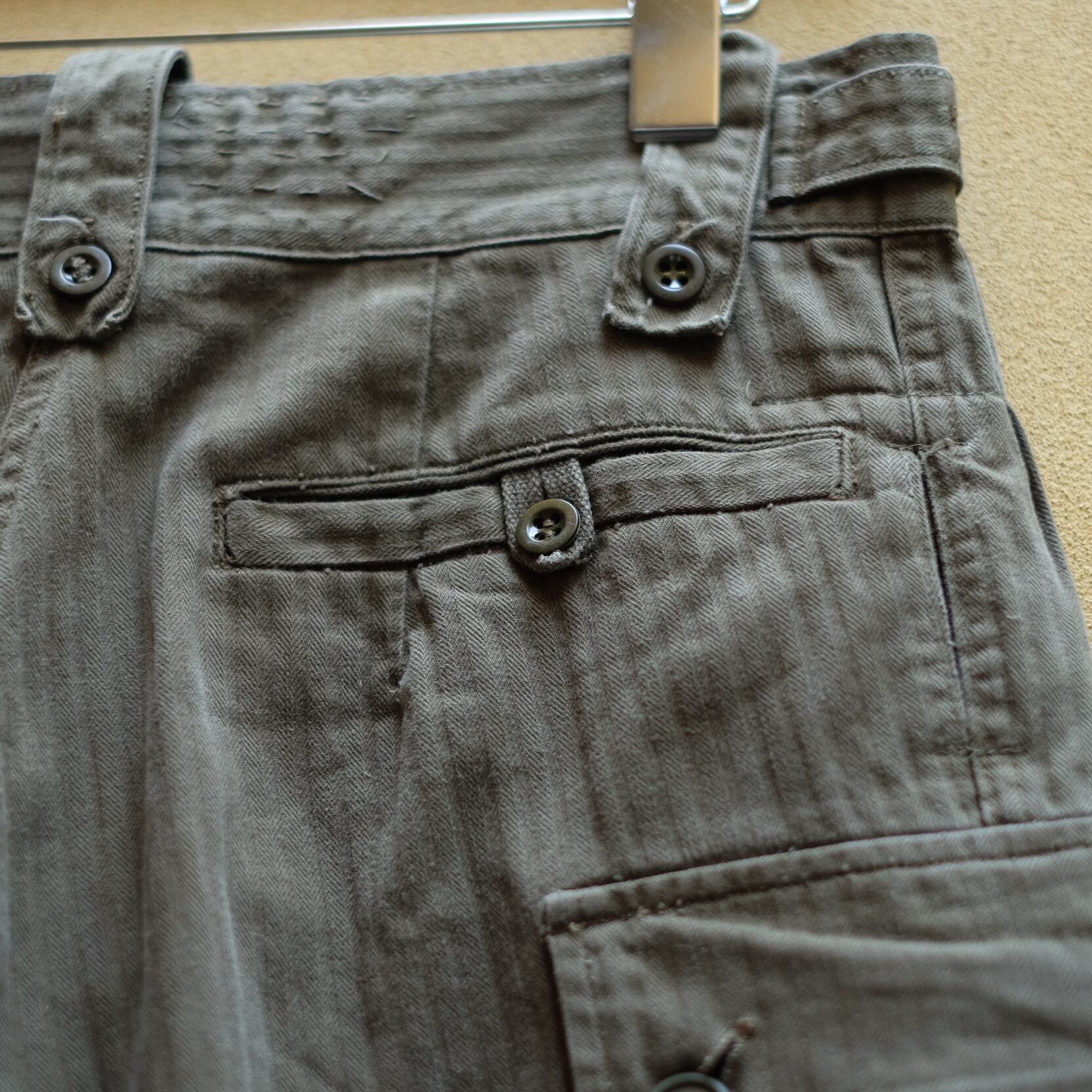 ヘリンボーン、特徴的なベルトループ、サイドアジャスターが目を引きます。