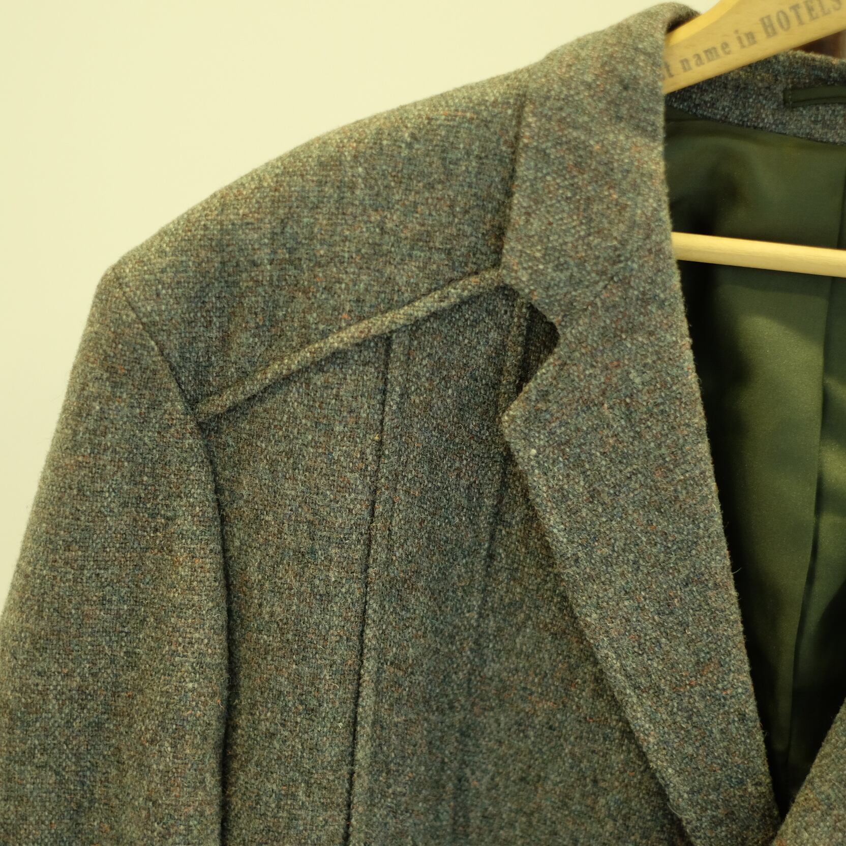 ノーフォークジャケットらしいベルトとアクションプリーツがしっかりと入ったこちらは多色糸で織り込まれたツイードを使用しております。