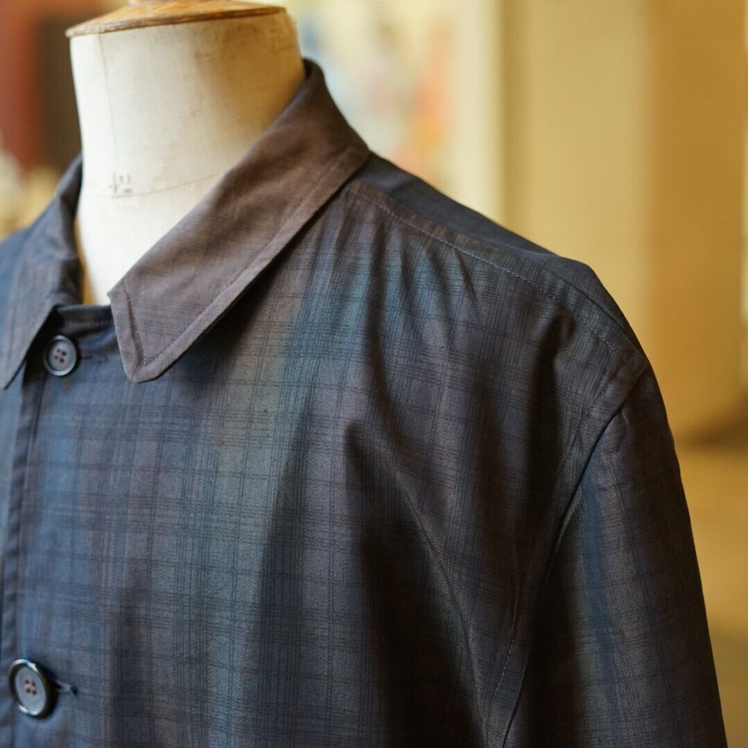 悪天候にも対応できるようなオールウェザーコートという通称のため、梅雨時期にもオススメの1着です。機能性から見るに恐らく化繊混かと思いますが、トーンの暗いチェックが良いデザインになっております。