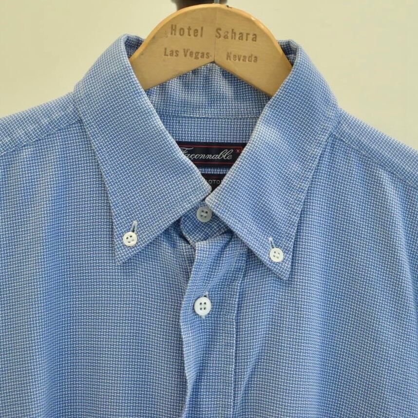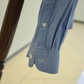 シングルカフスに胸ポケット付きと黄海いただきやすいこちらは、青と白の織柄が特徴的です。