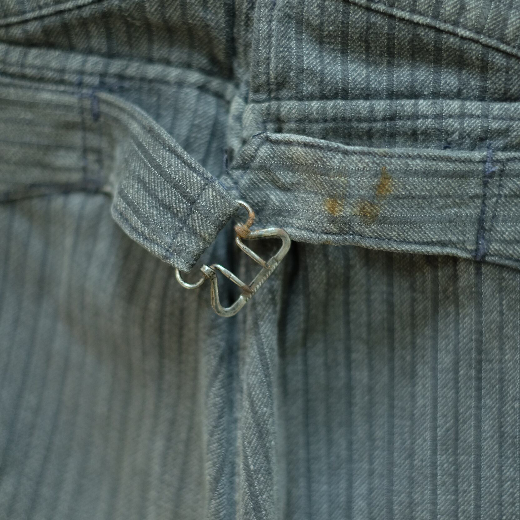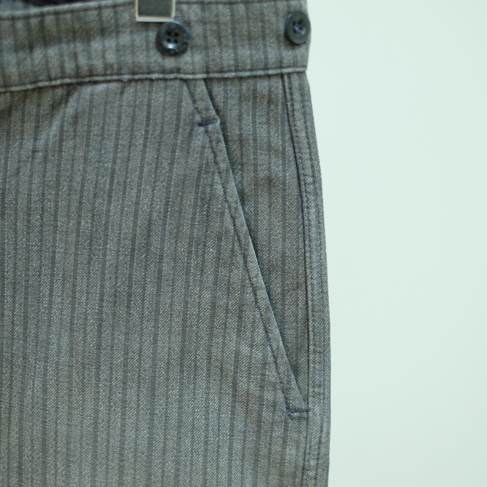 モノトーンストライプコットン素材に、ワイドストレートのシルエットが格好良いこちらは、サスペンダーボタンにシンチバックと古めの年代らしいディティールも素晴らしいです。