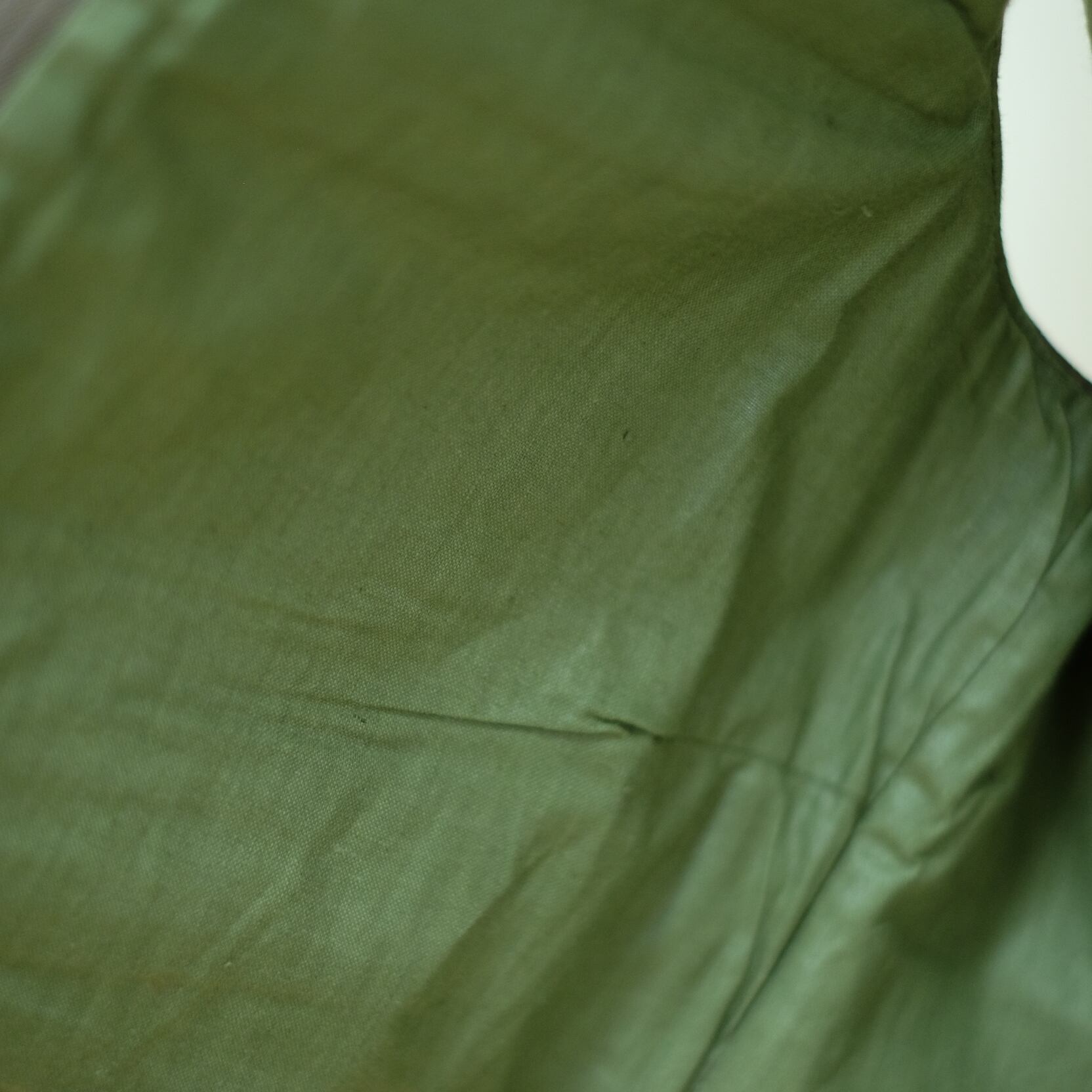 後身頃にはブラックのリネンも混じりそうな光沢ある素材、裏地にはグリーンのリネン混生地が使用されています。