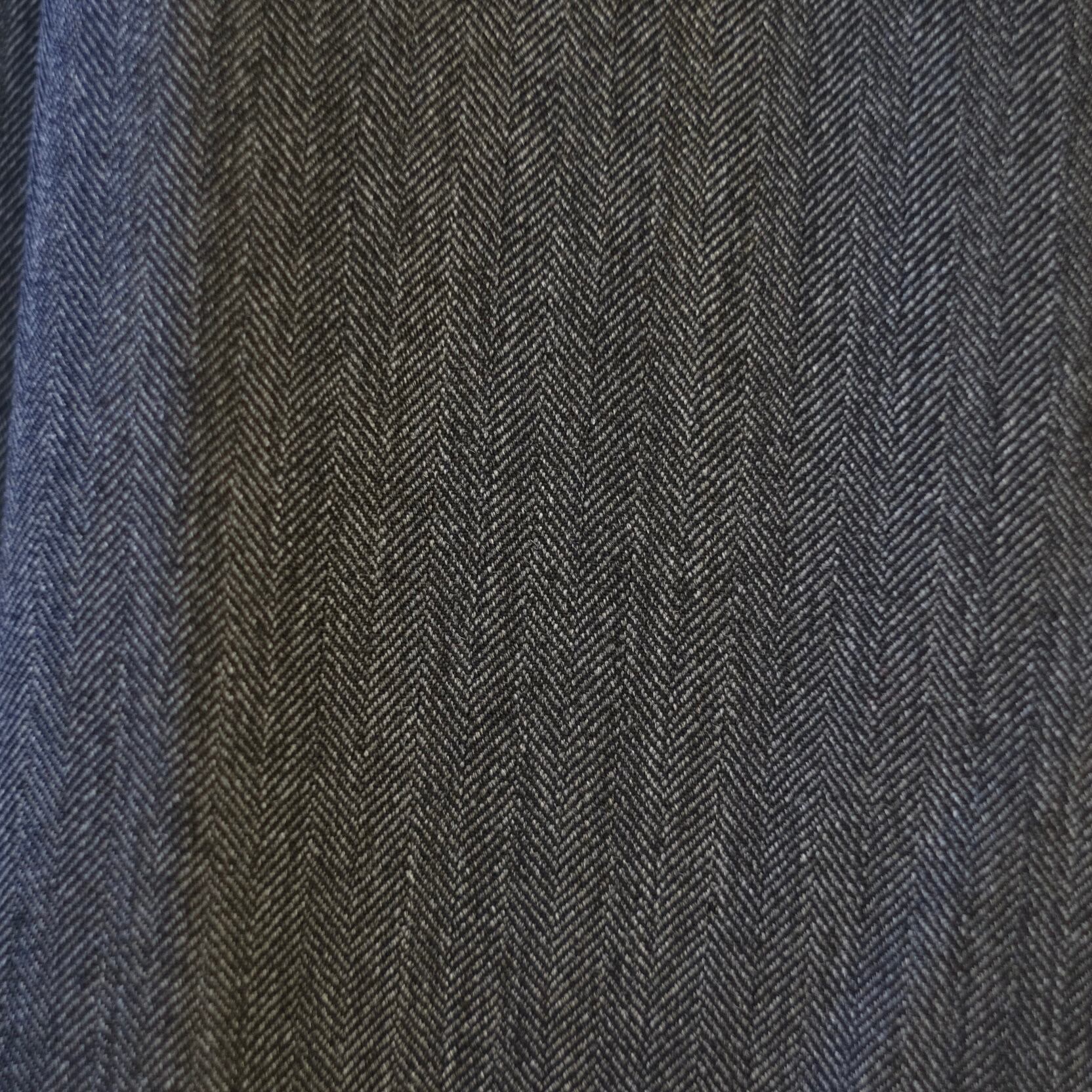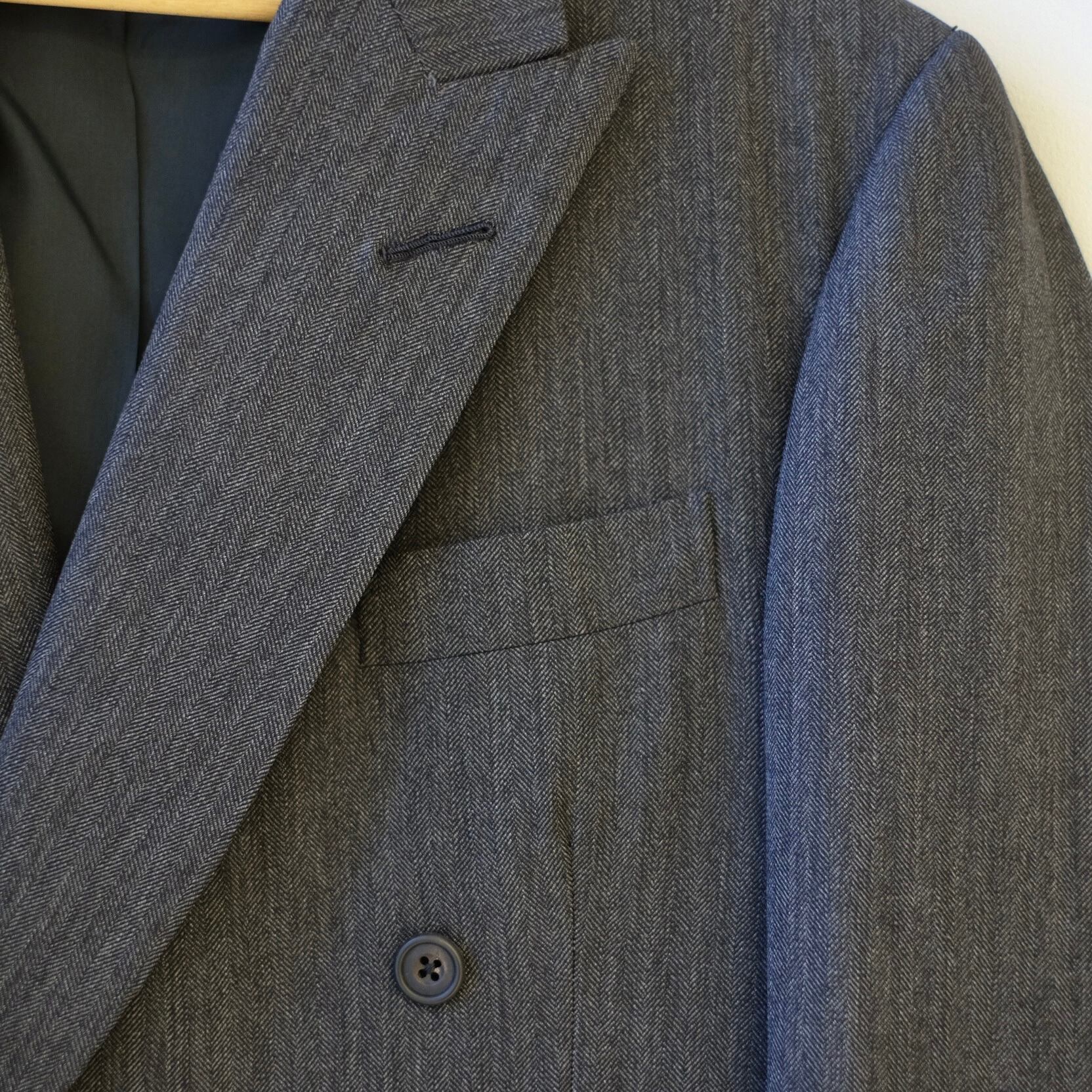 チャコールグレーのヘリンボーンの織柄、袖先はクラシカルな4つボタンの開き見せ。